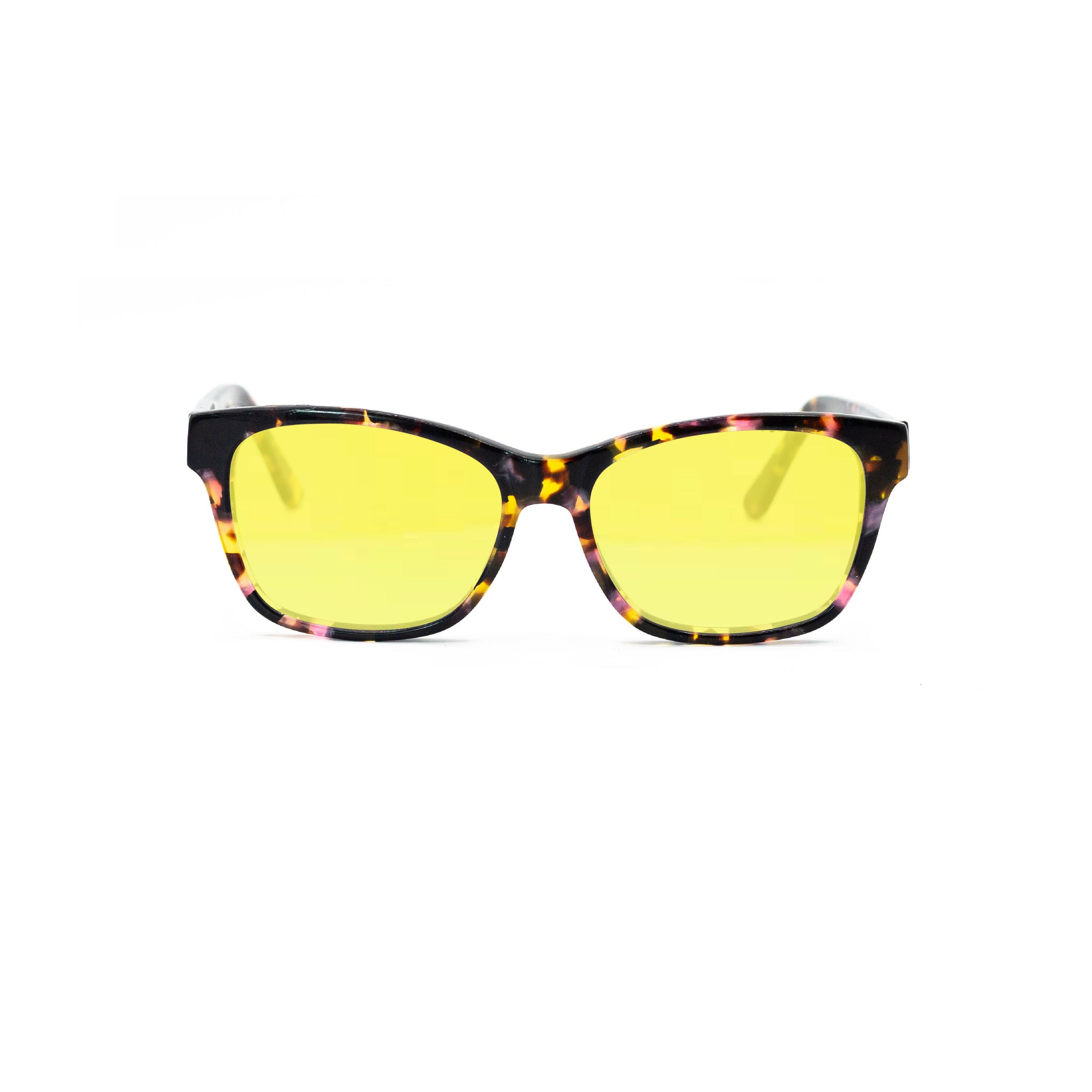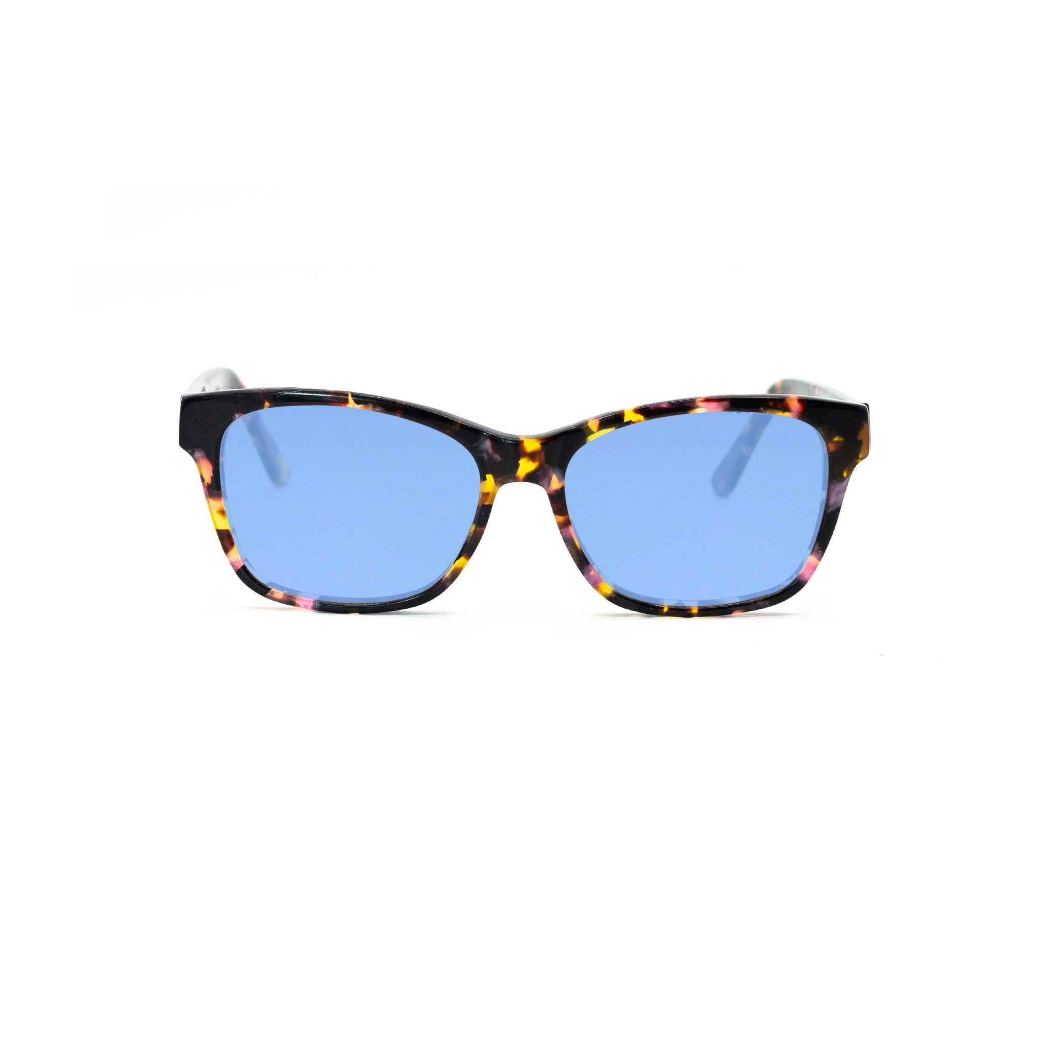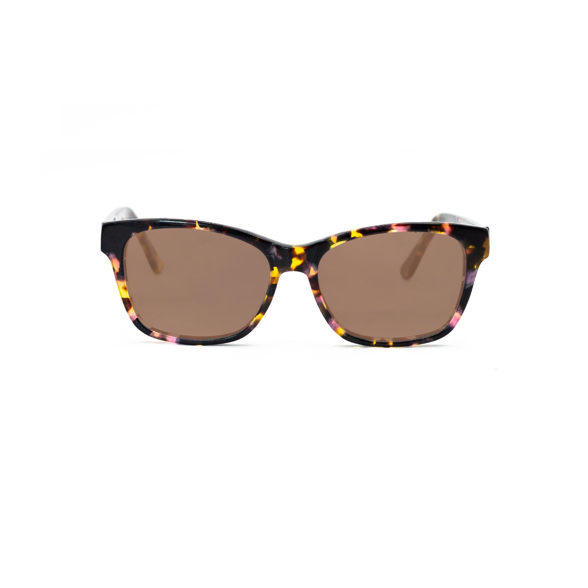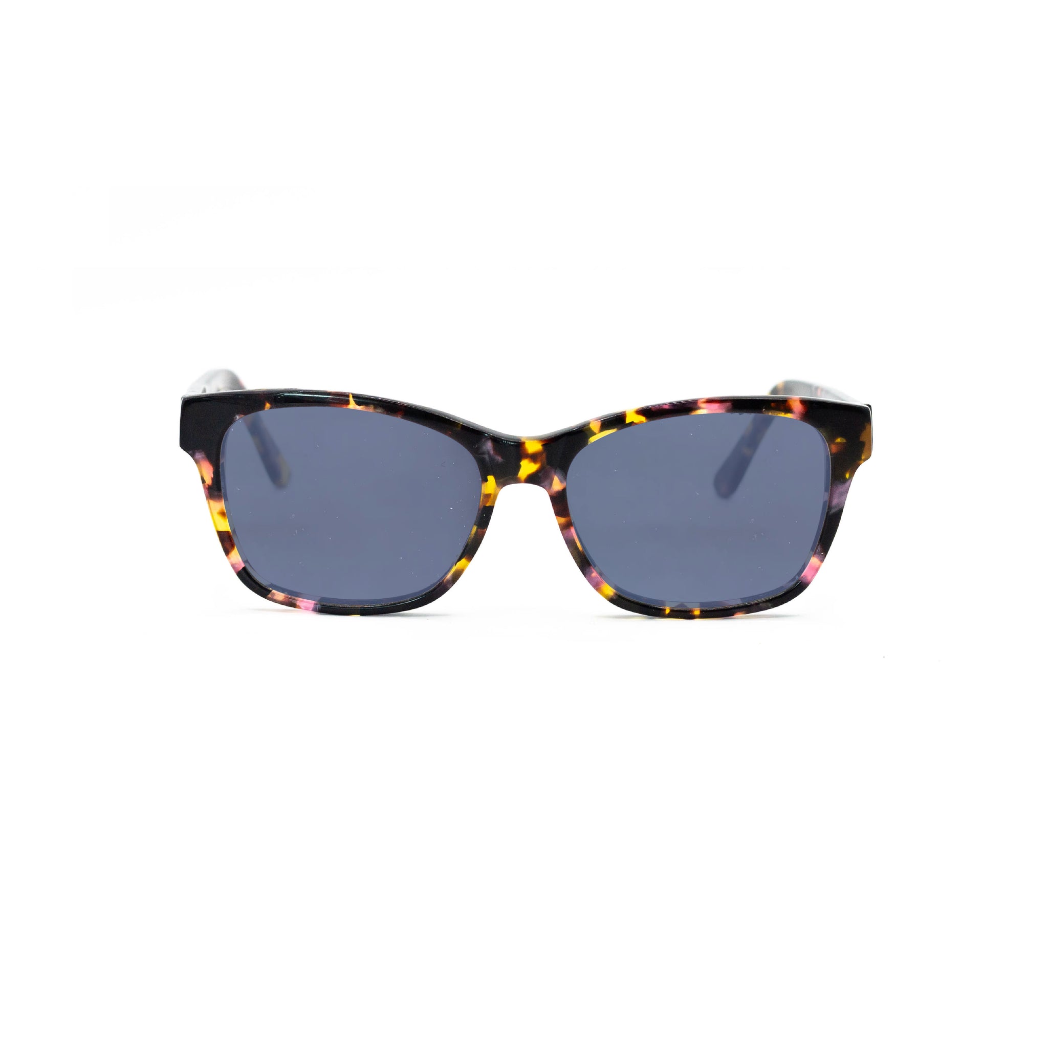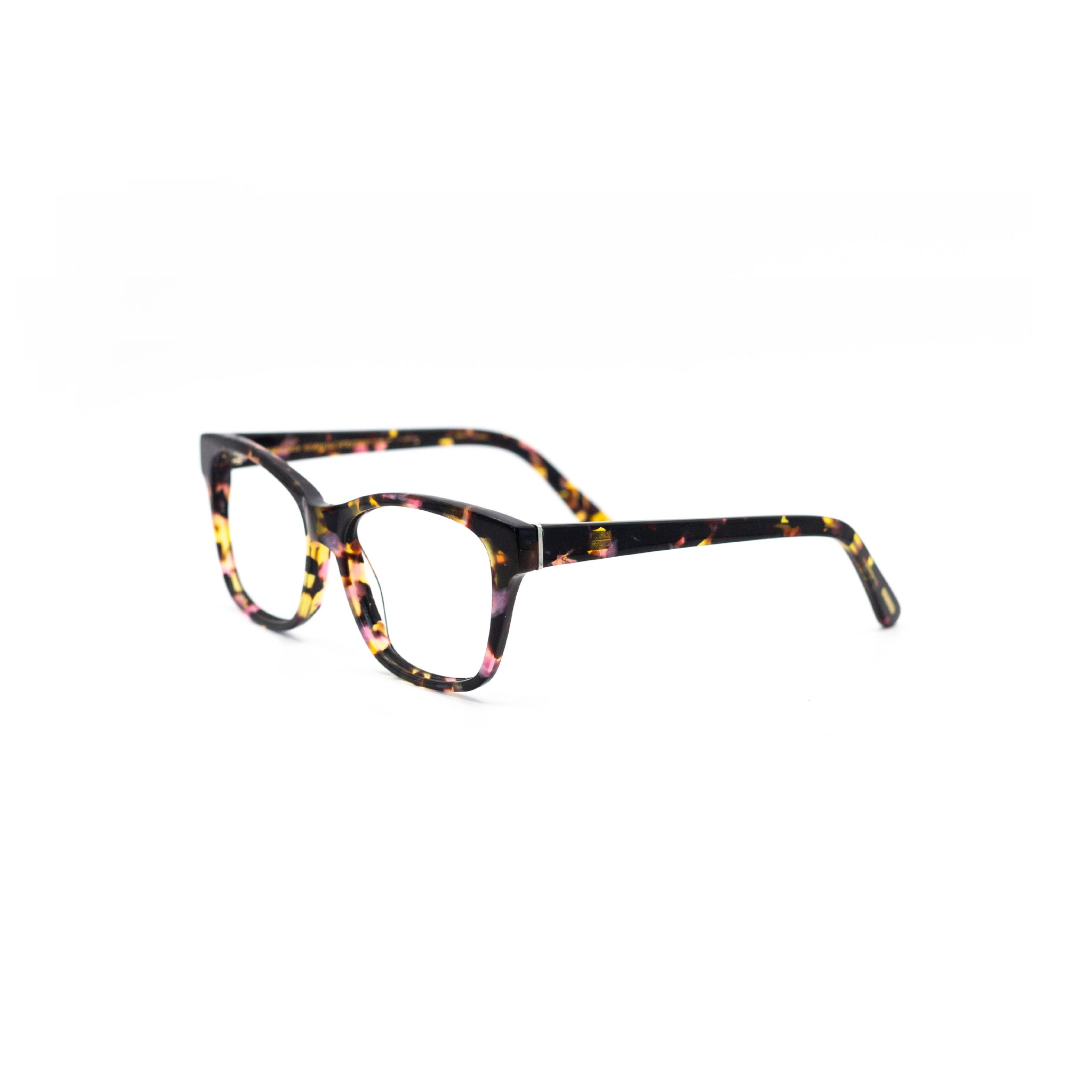 Avec leur forme rectangulaire légèrement papillon, cette monture en acétate apporte du dynamisme au regard tout en flattant les traits du visage. Le motif écaille multicolore mêle des nuances de rose, jaune, orange et noir, pour un effet marbré joyeux et plein de caractère. Parfait pour illuminer un visage et réveiller une tenue sobre.
