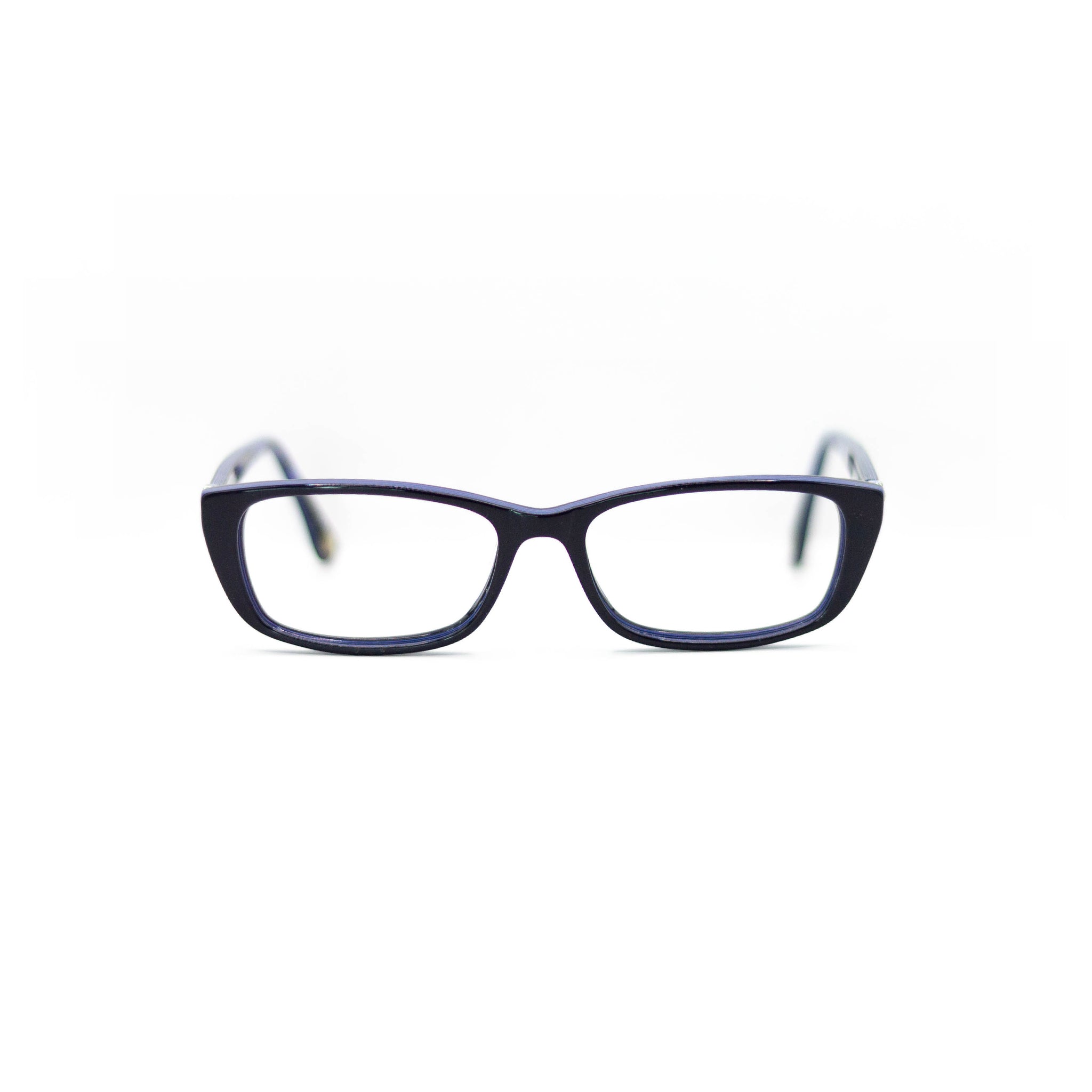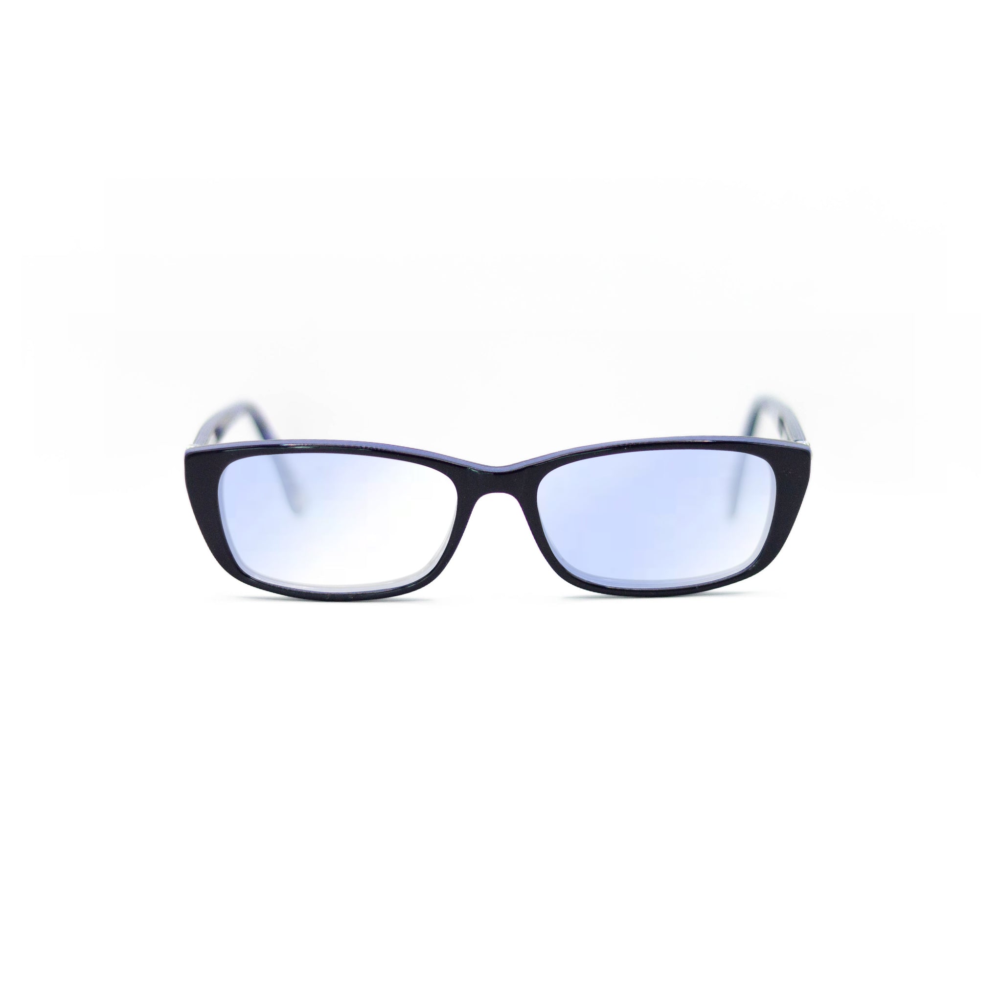 Cette monture en acétate adopte une forme rectangulaire légèrement papillon, aux angles subtilement adoucis. Le coloris bleu nuit profond, presque noir selon la lumière, est rehaussé de reflets translucides qui lui donnent du relief et de la personnalité sans en faire trop.