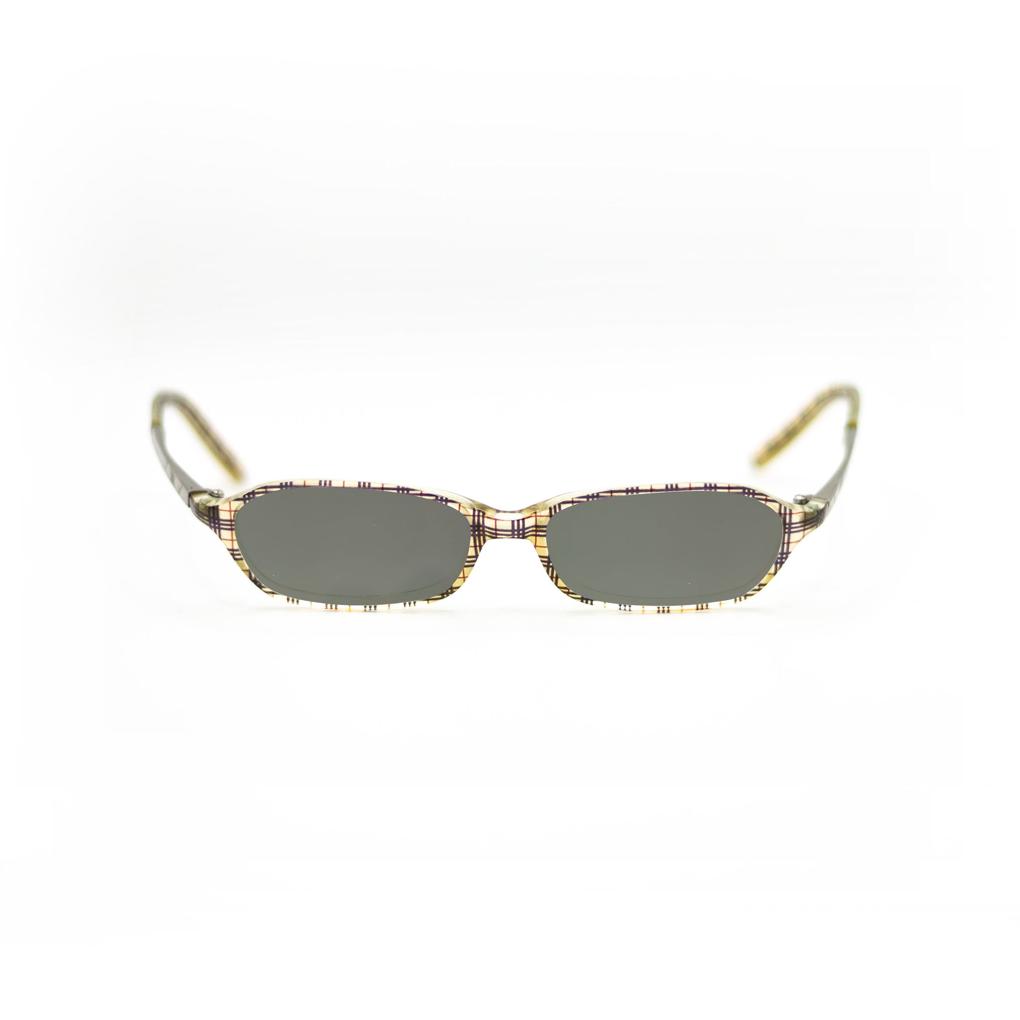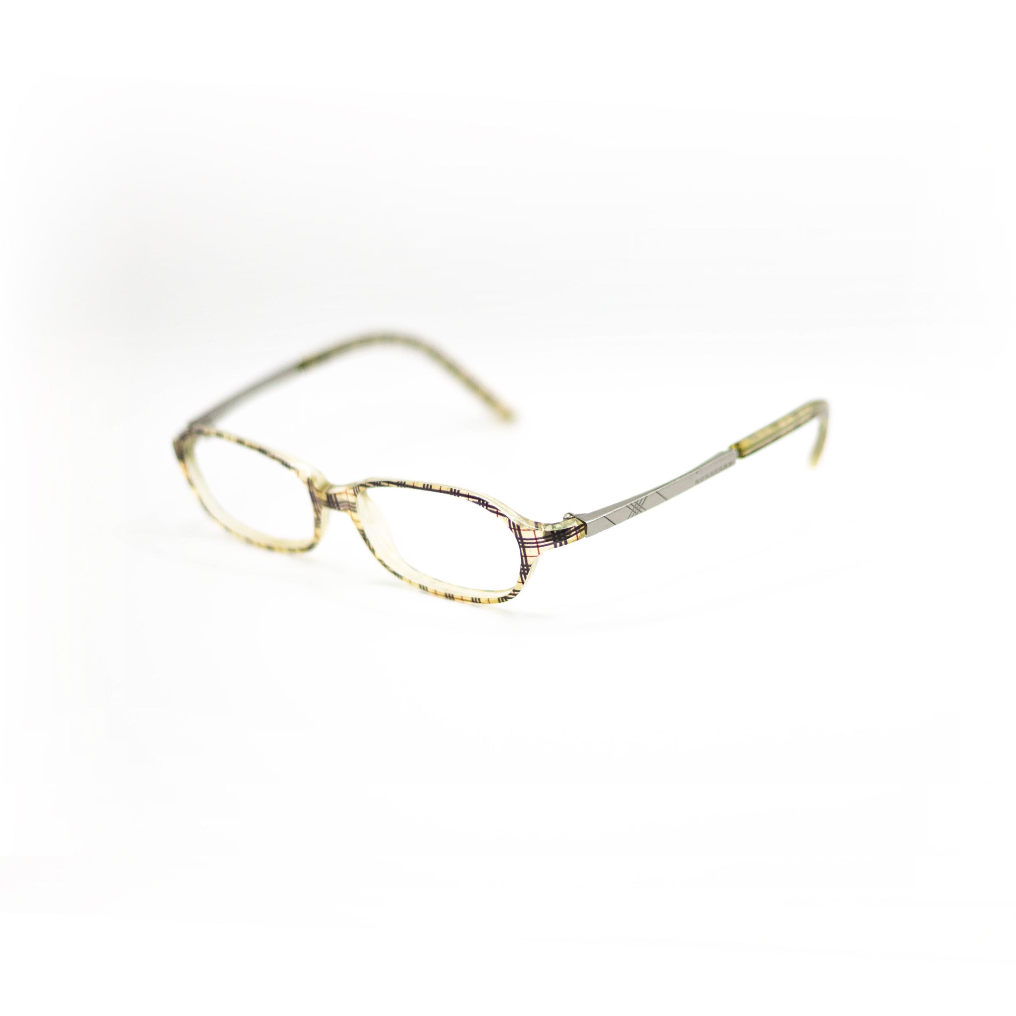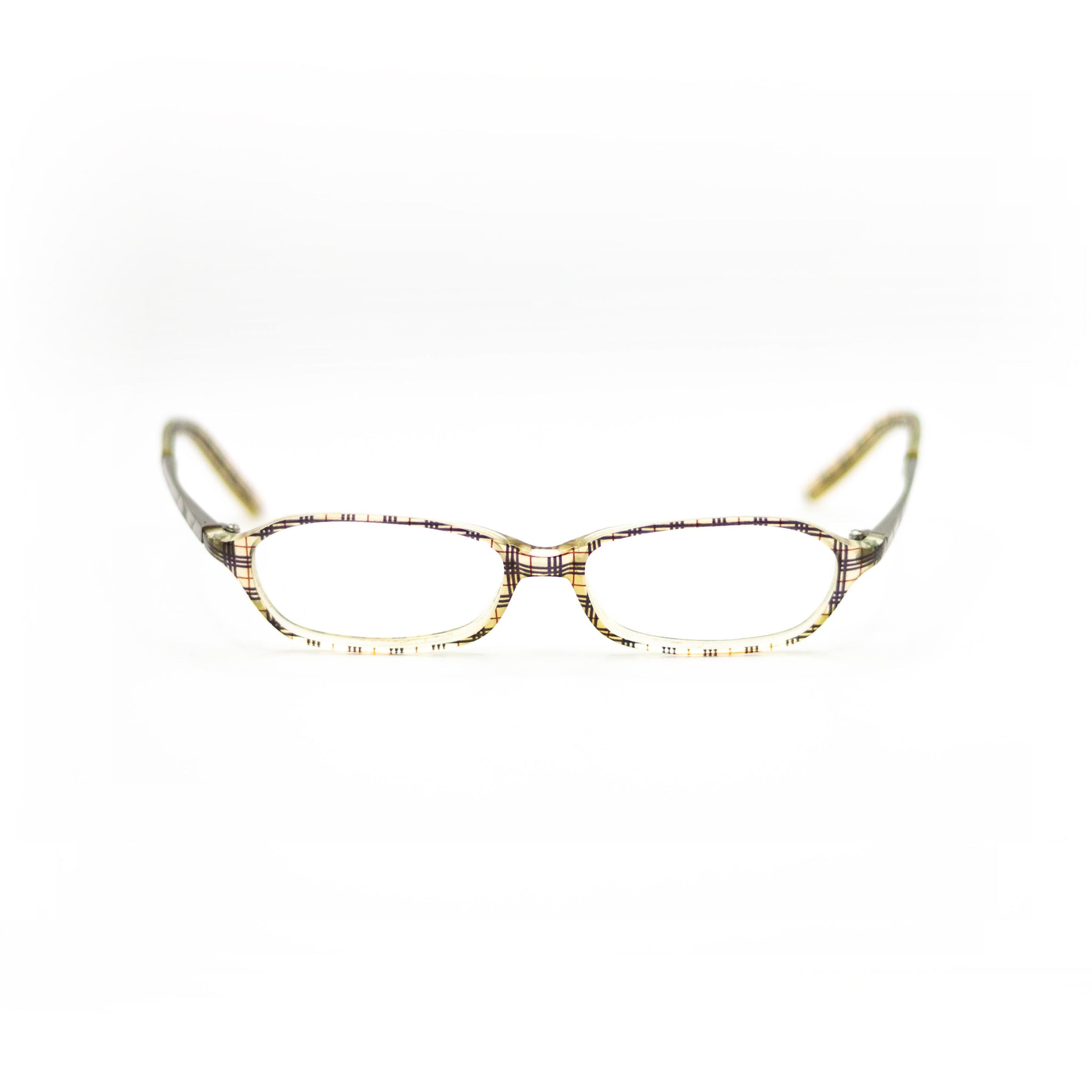 Cette monture rectangulaire fine associe un cerclage en acétate translucide crème orné du célèbre motif check Burberry, à des branches en métal clair, gravées du logo de la marque. Le contraste discret entre les matériaux et les teintes confère à l’ensemble une allure à la fois élégante et singulière, parfaite pour celles et ceux qui souhaitent affirmer leur style avec discrétion.