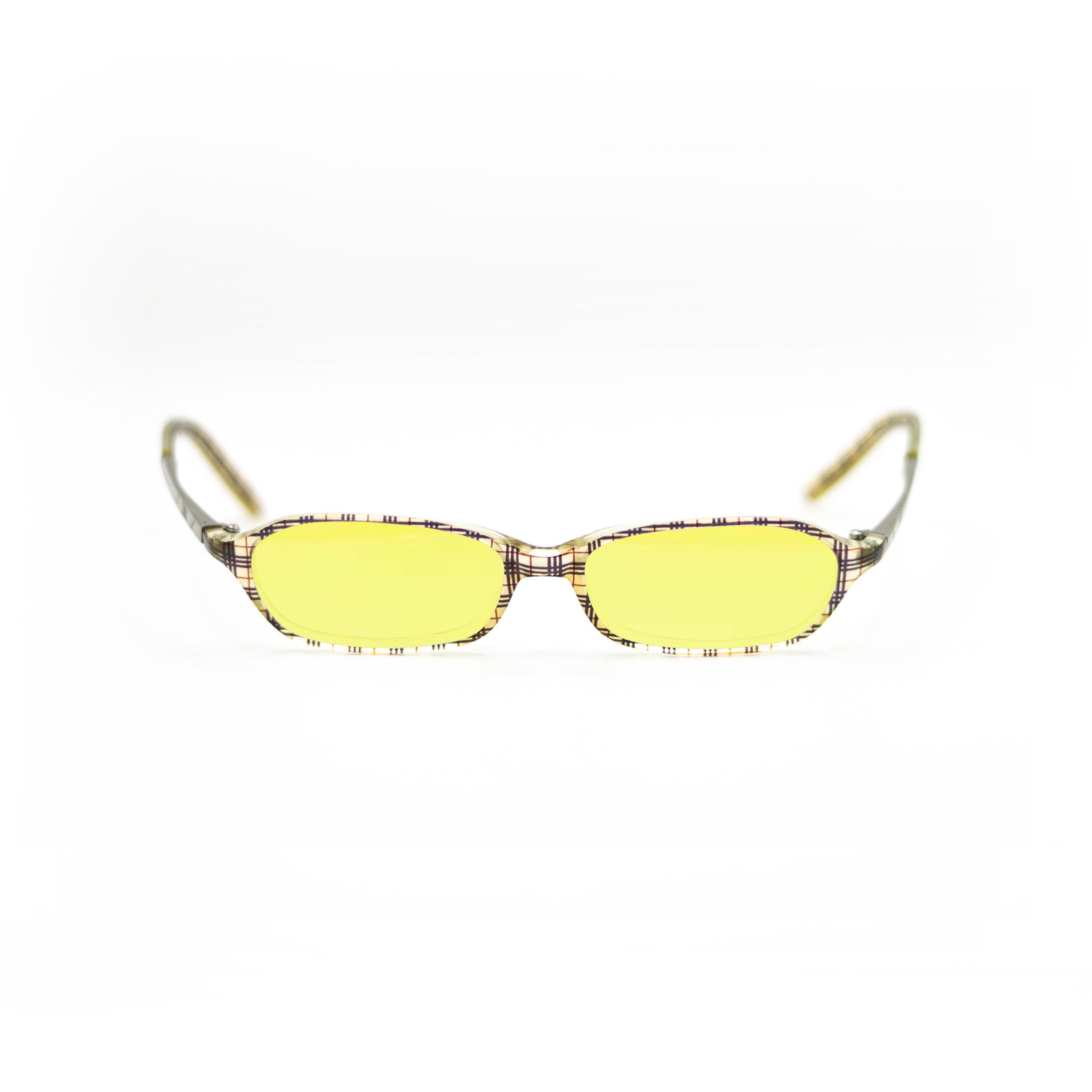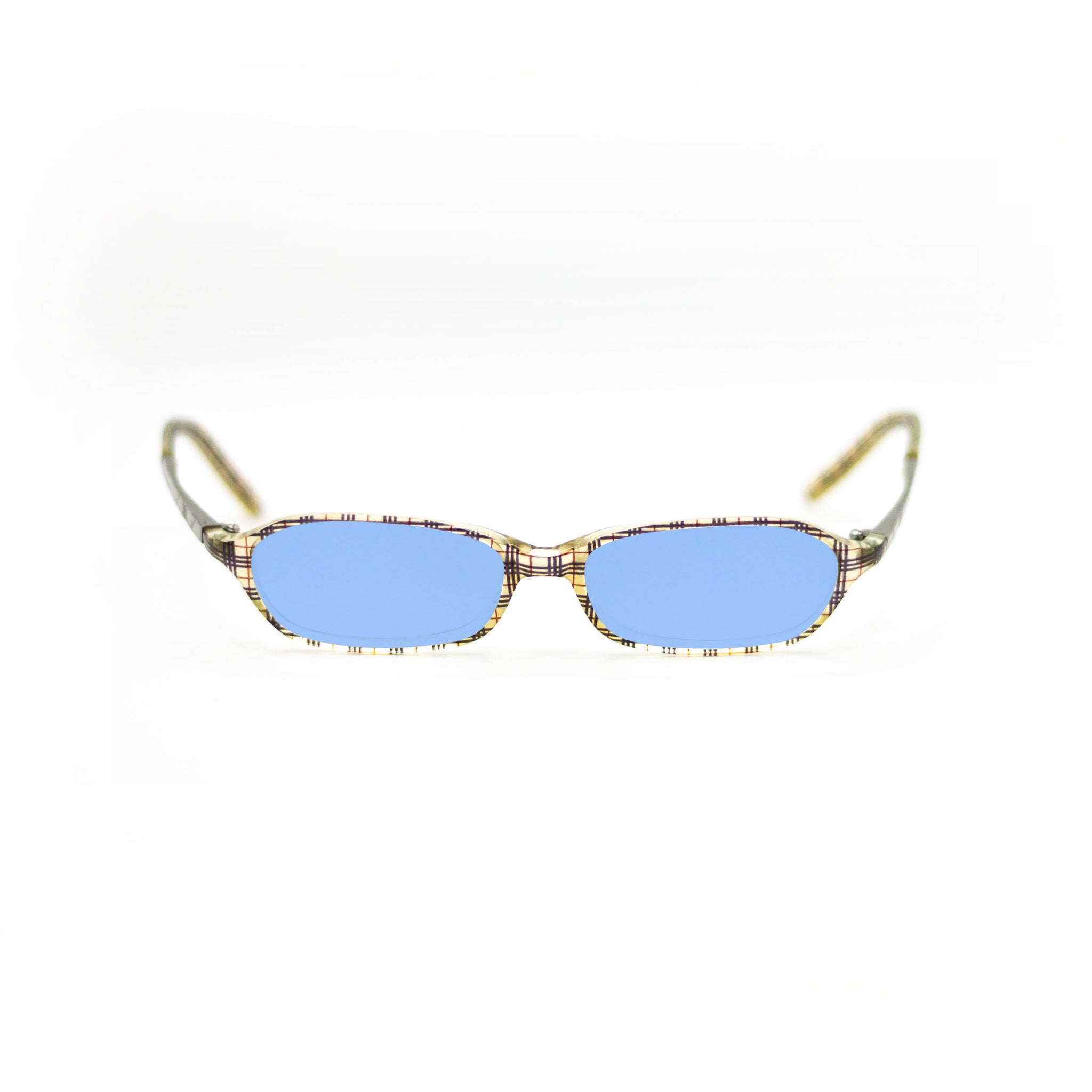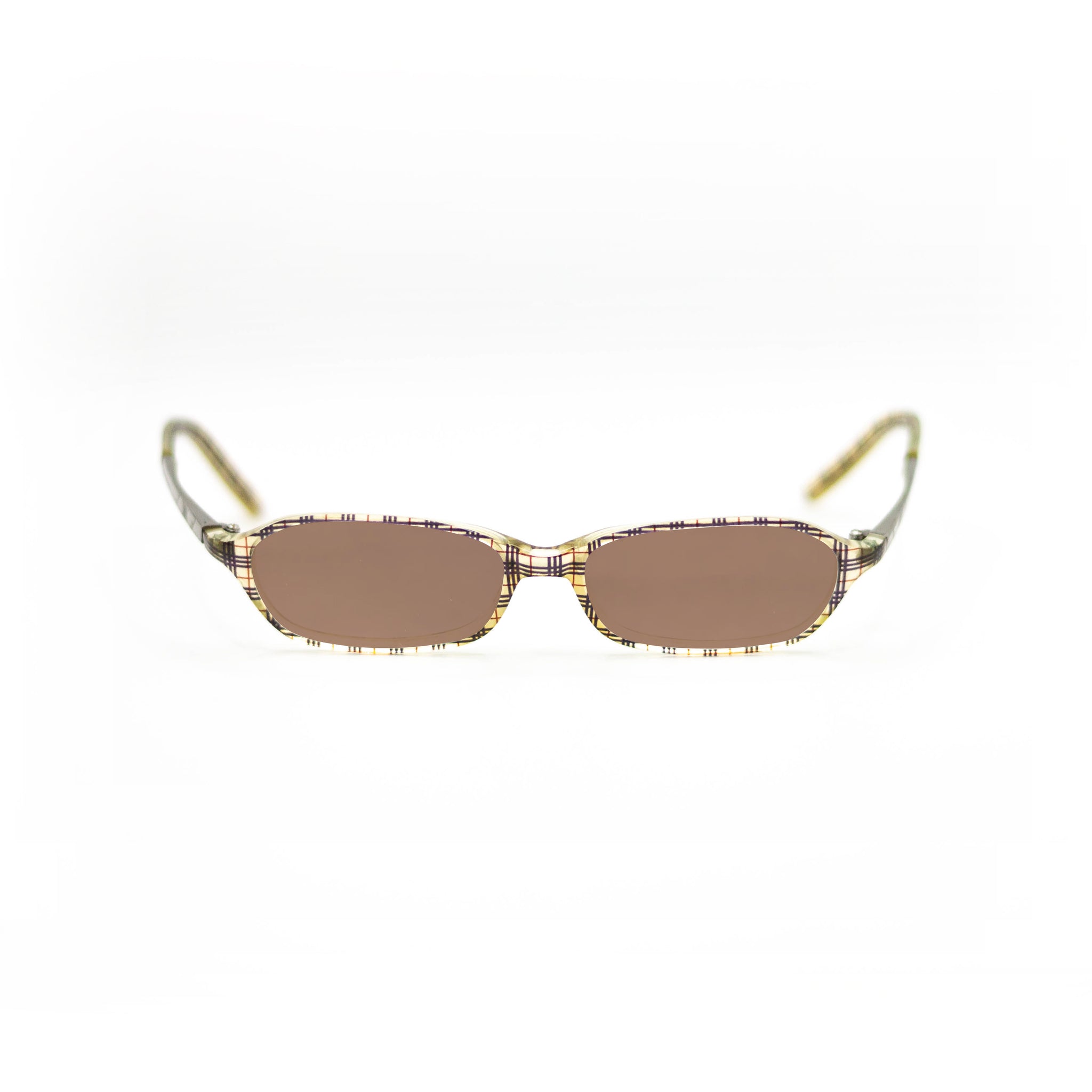 Cette monture rectangulaire fine associe un cerclage en acétate translucide crème orné du célèbre motif check Burberry, à des branches en métal clair, gravées du logo de la marque. Le contraste discret entre les matériaux et les teintes confère à l’ensemble une allure à la fois élégante et singulière, parfaite pour celles et ceux qui souhaitent affirmer leur style avec discrétion.