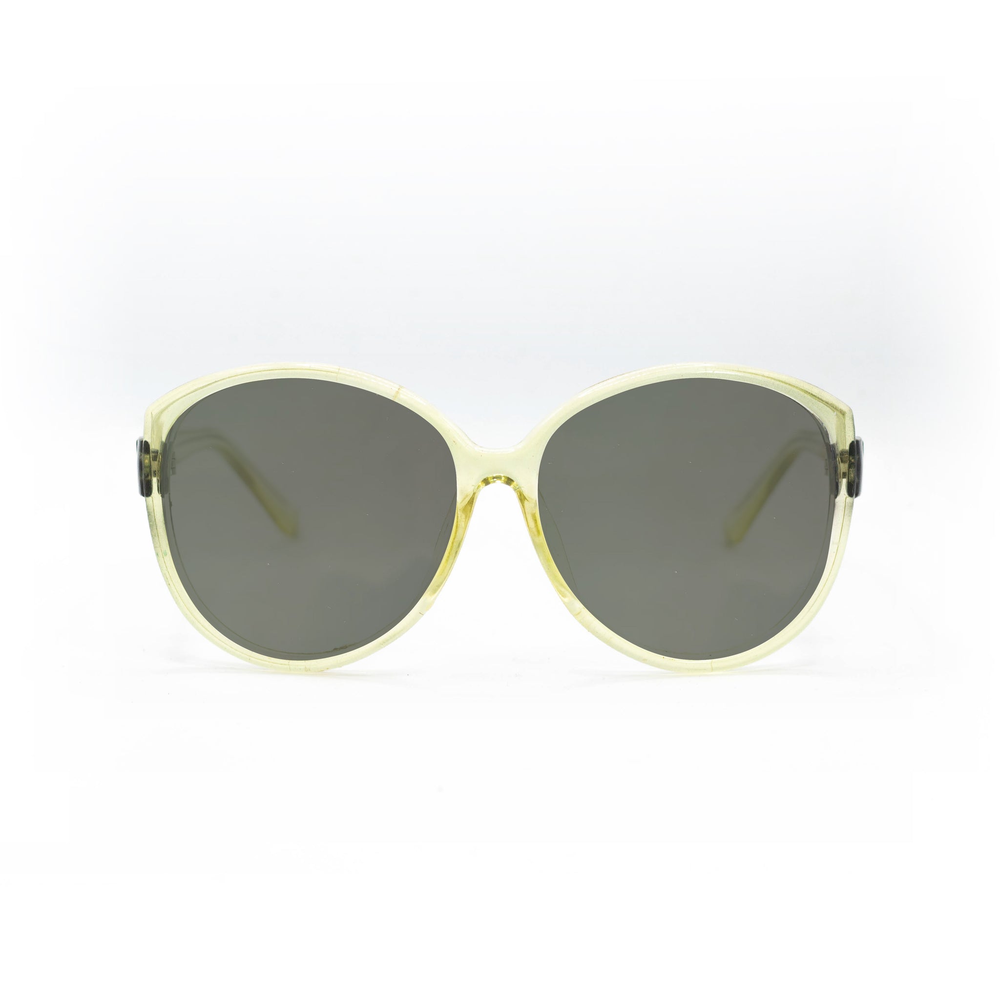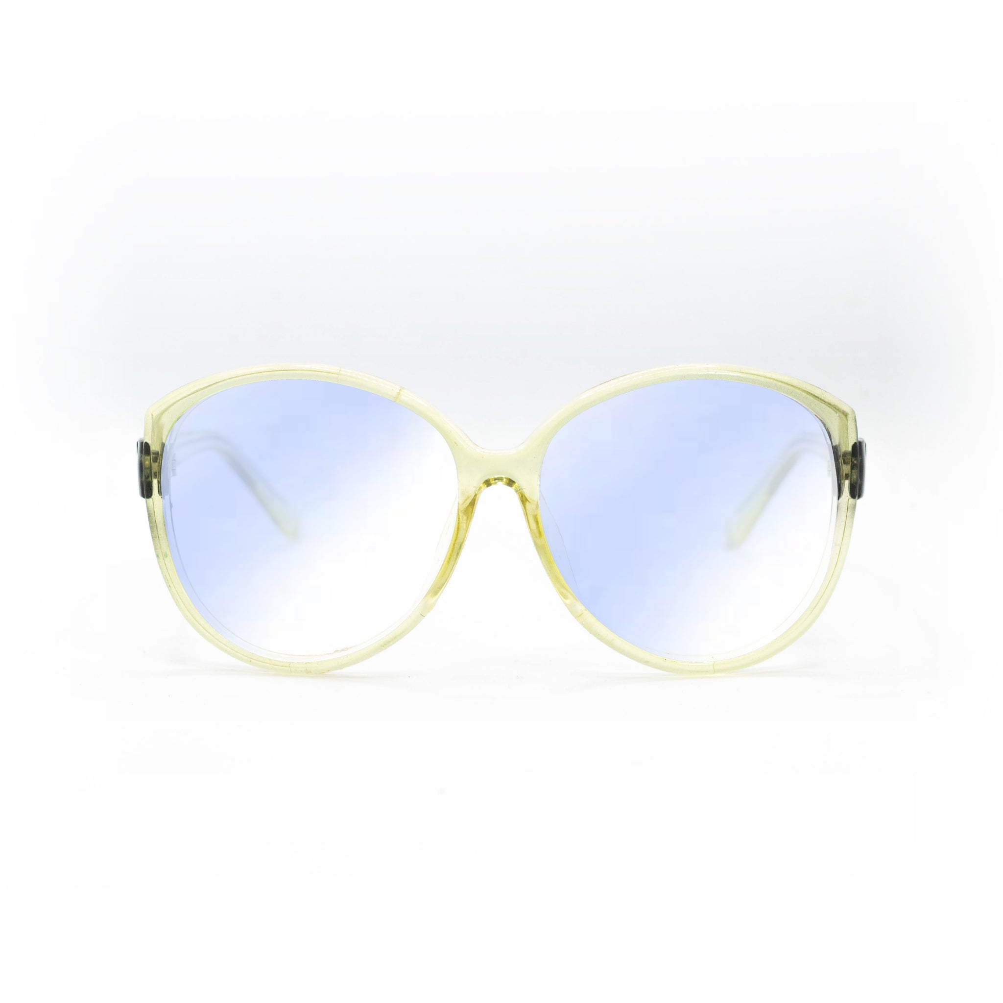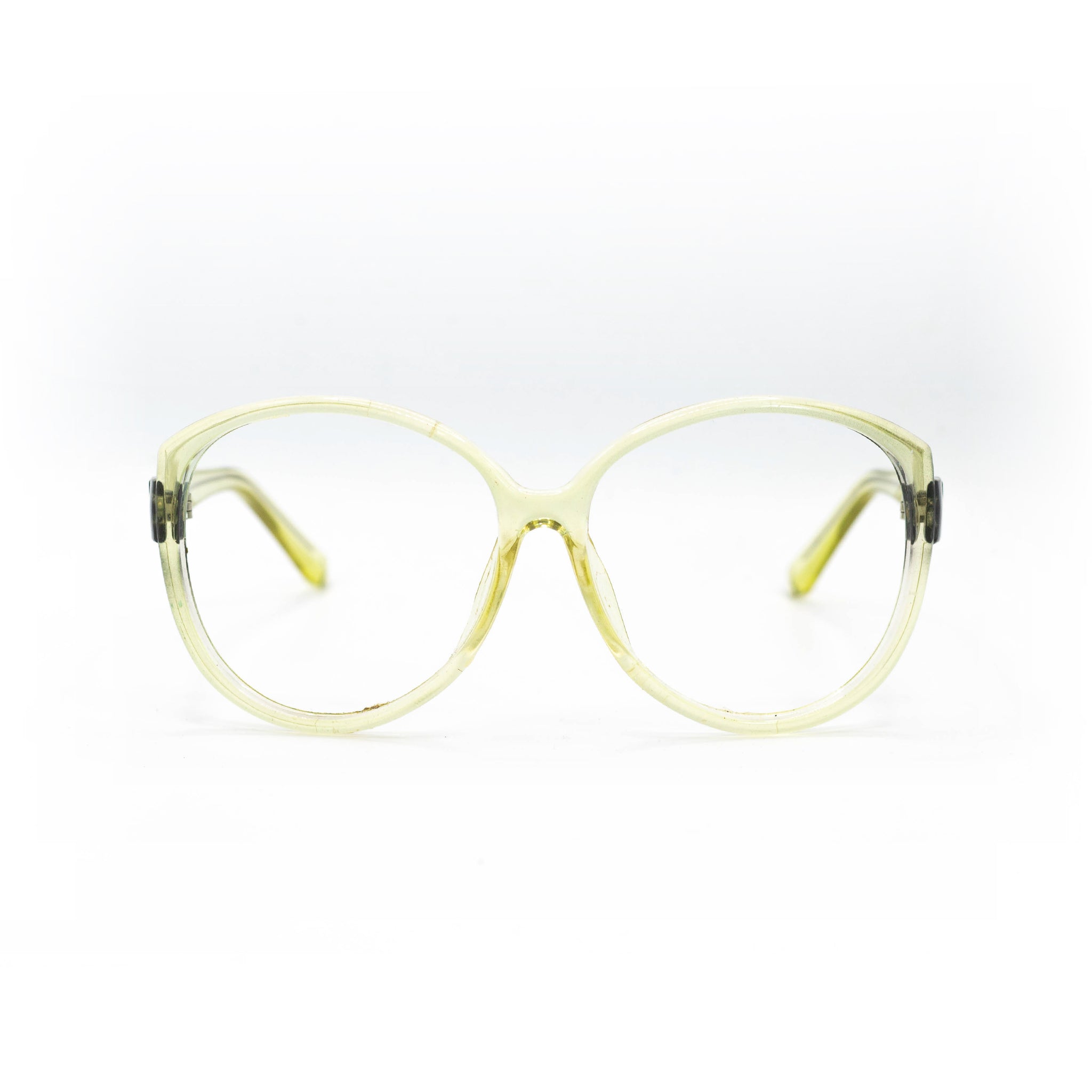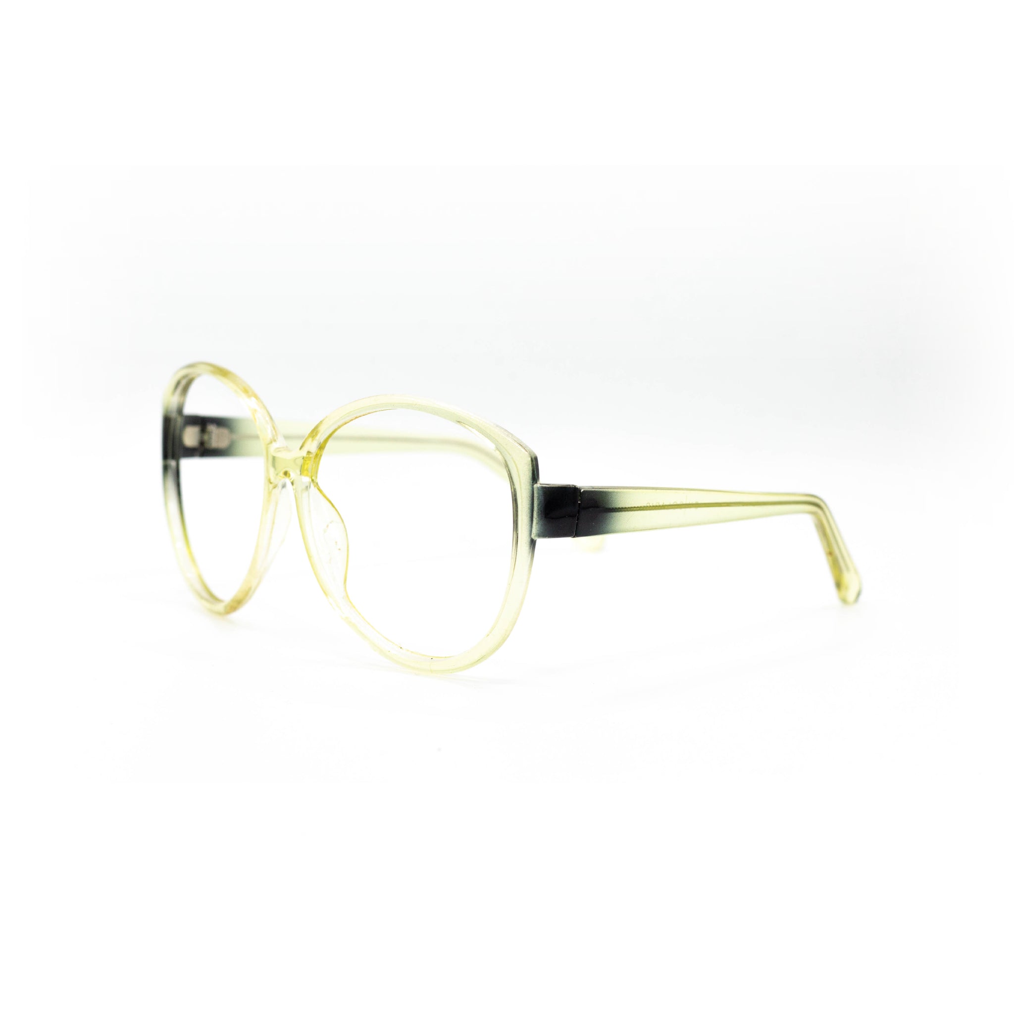 La monture en acétate adopte une forme pantos oversize très arrondie, avec un pont légèrement marqué qui structure l’ensemble. Le coloris se distingue par un dégradé translucide vert anis et noir fumé, qui joue subtilement avec la lumière tout en conservant une belle légèreté visuelle.