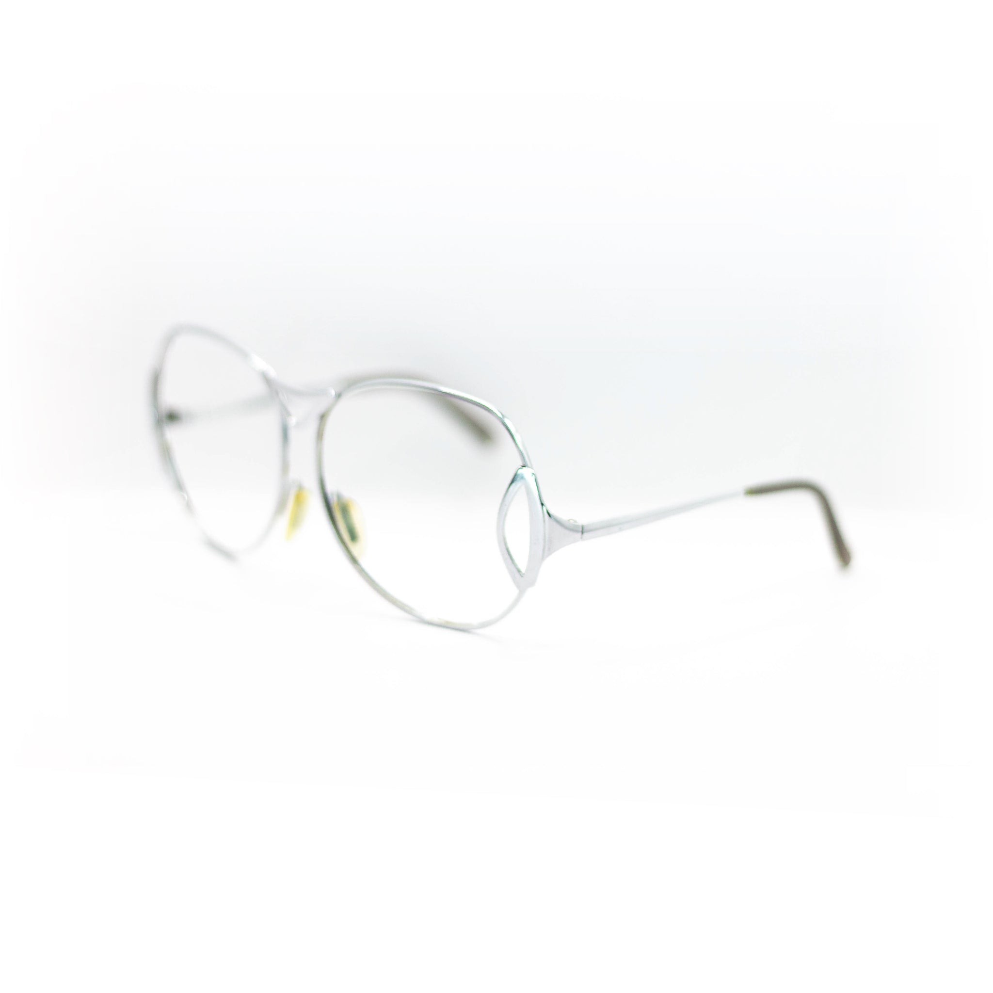 Cette monture fine en métal argenté séduit par sa forme ovale adoucie, à mi-chemin entre le papillon et l’œil de chat. Son design se distingue par un détail ajouré sur les côtés, signature élégante d’une époque où le raffinement passait par le détail. L’ensemble est léger, lumineux, résolument féminin et affirmé sans ostentation.