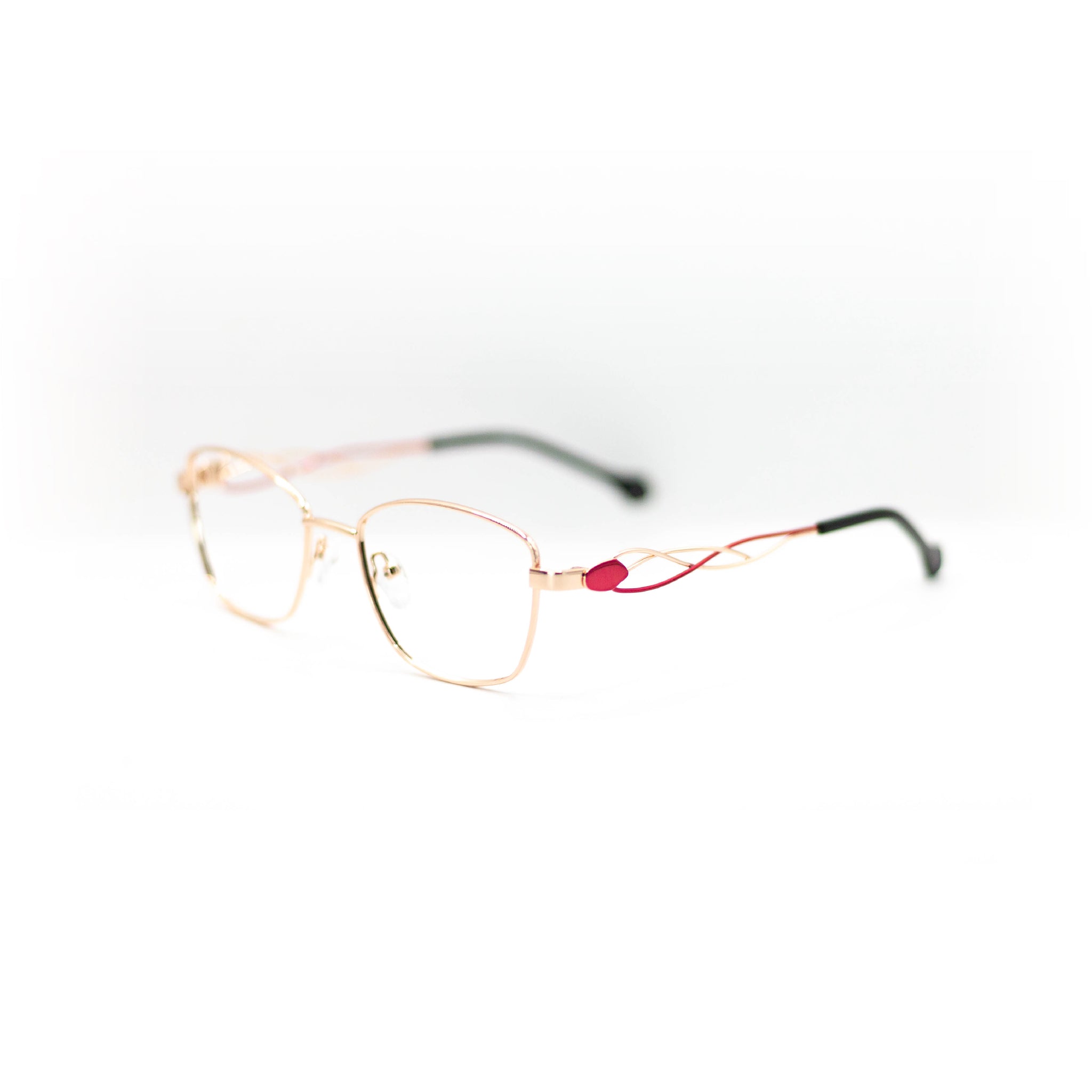 Avec leur monture fine en métal doré, ces lunettes jouent la carte de l’élégance délicate. Leur forme carrée légèrement arrondie apporte structure et douceur au regard, tandis que les branches ajourées entrelacées de doré et de rose offrent une finition graphique et aérienne, pleine de personnalité. Une monture qui ne laisse rien au hasard et qui affirme un style à la fois poétique et contemporain.