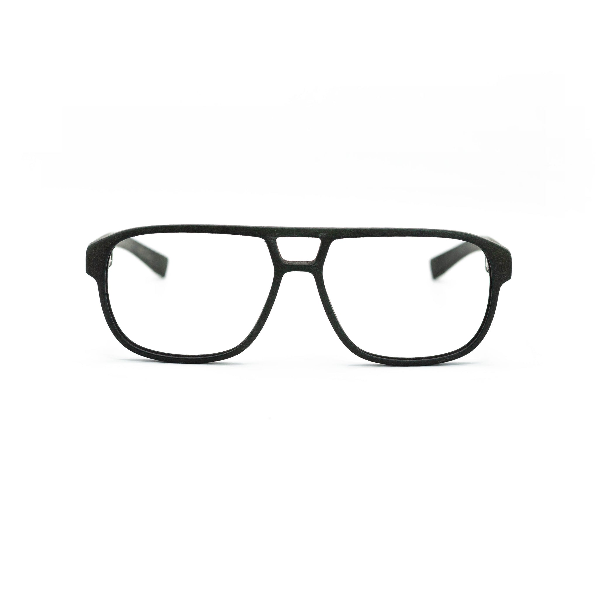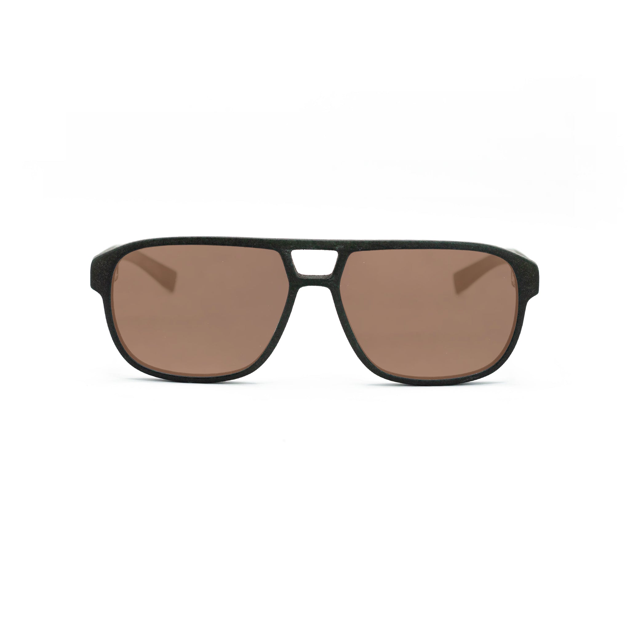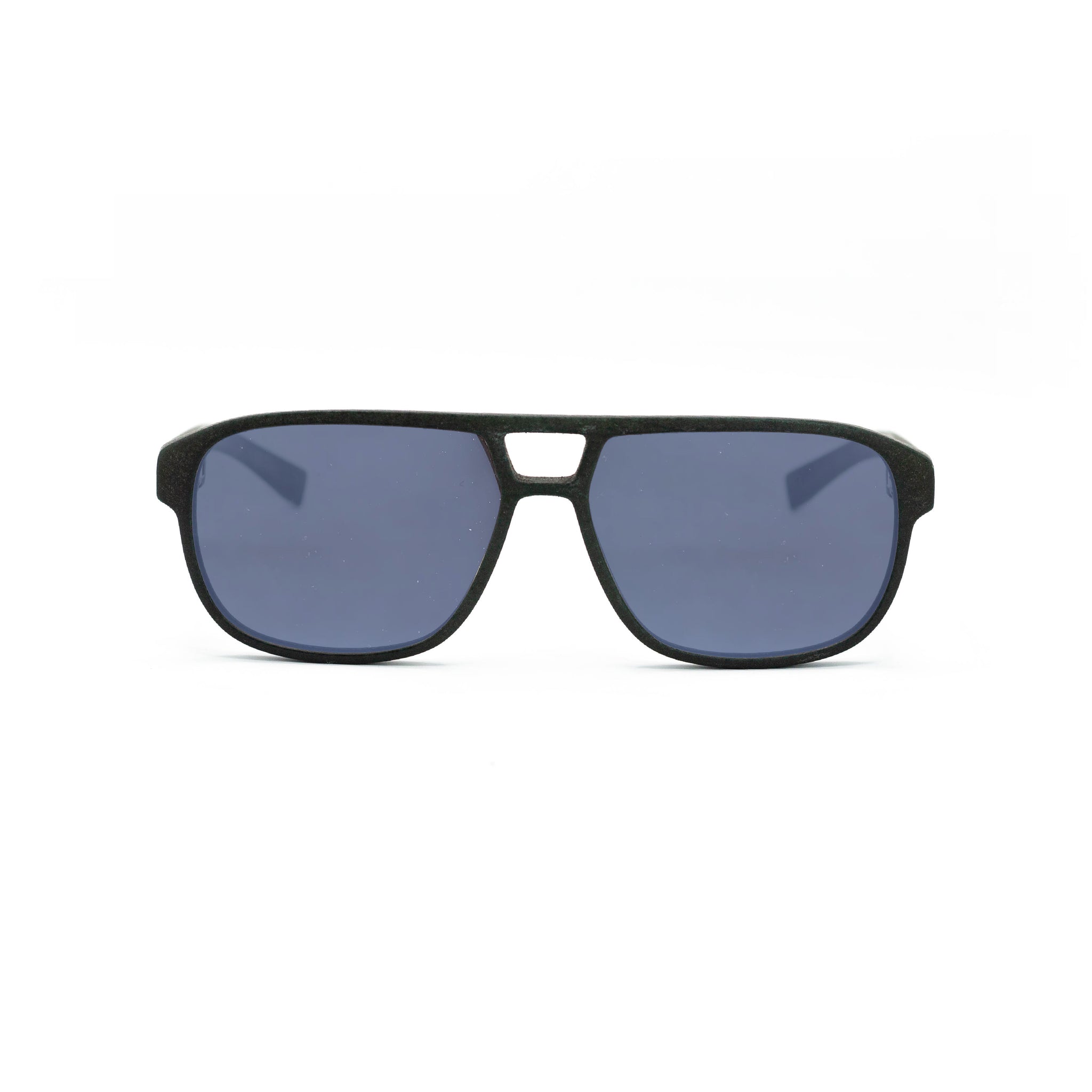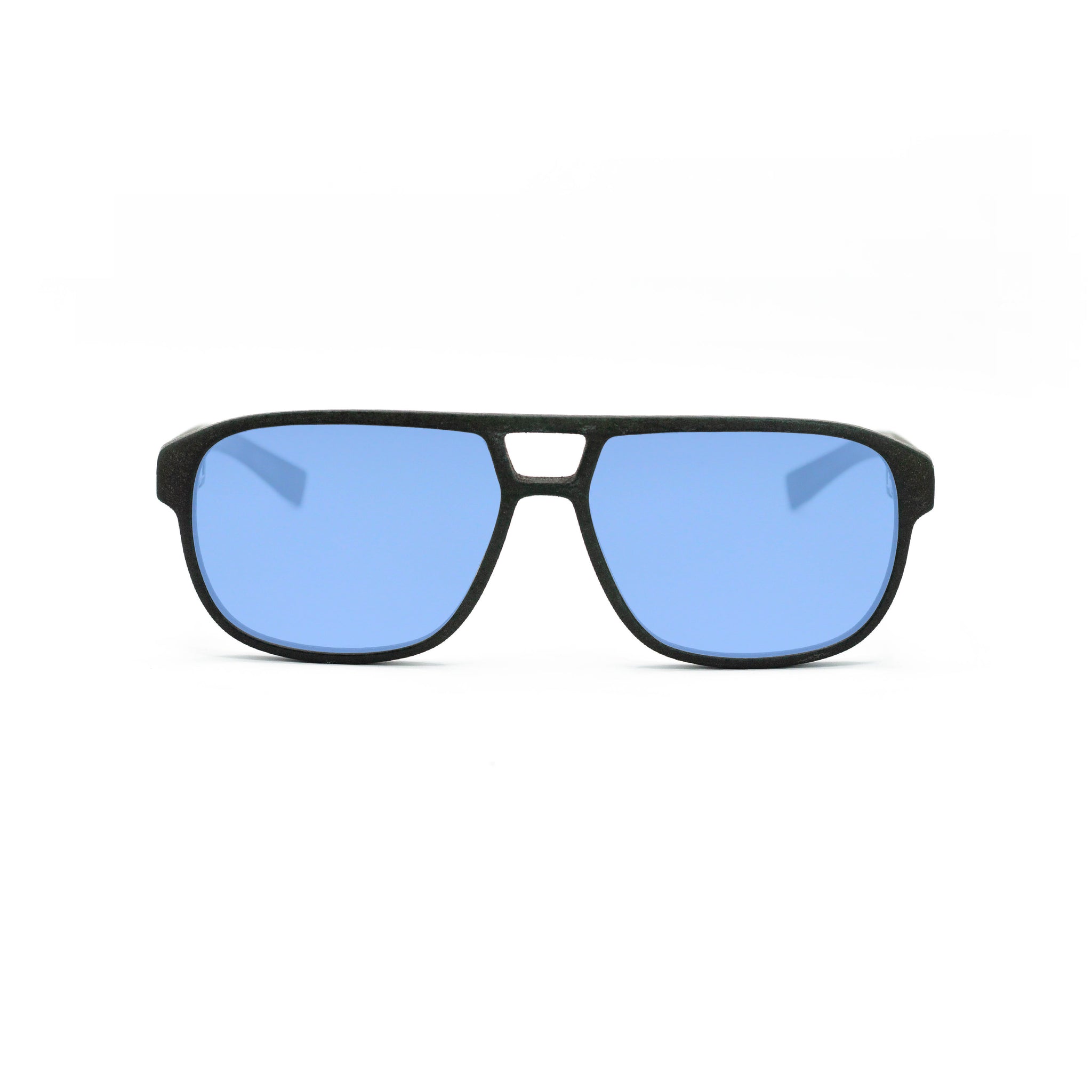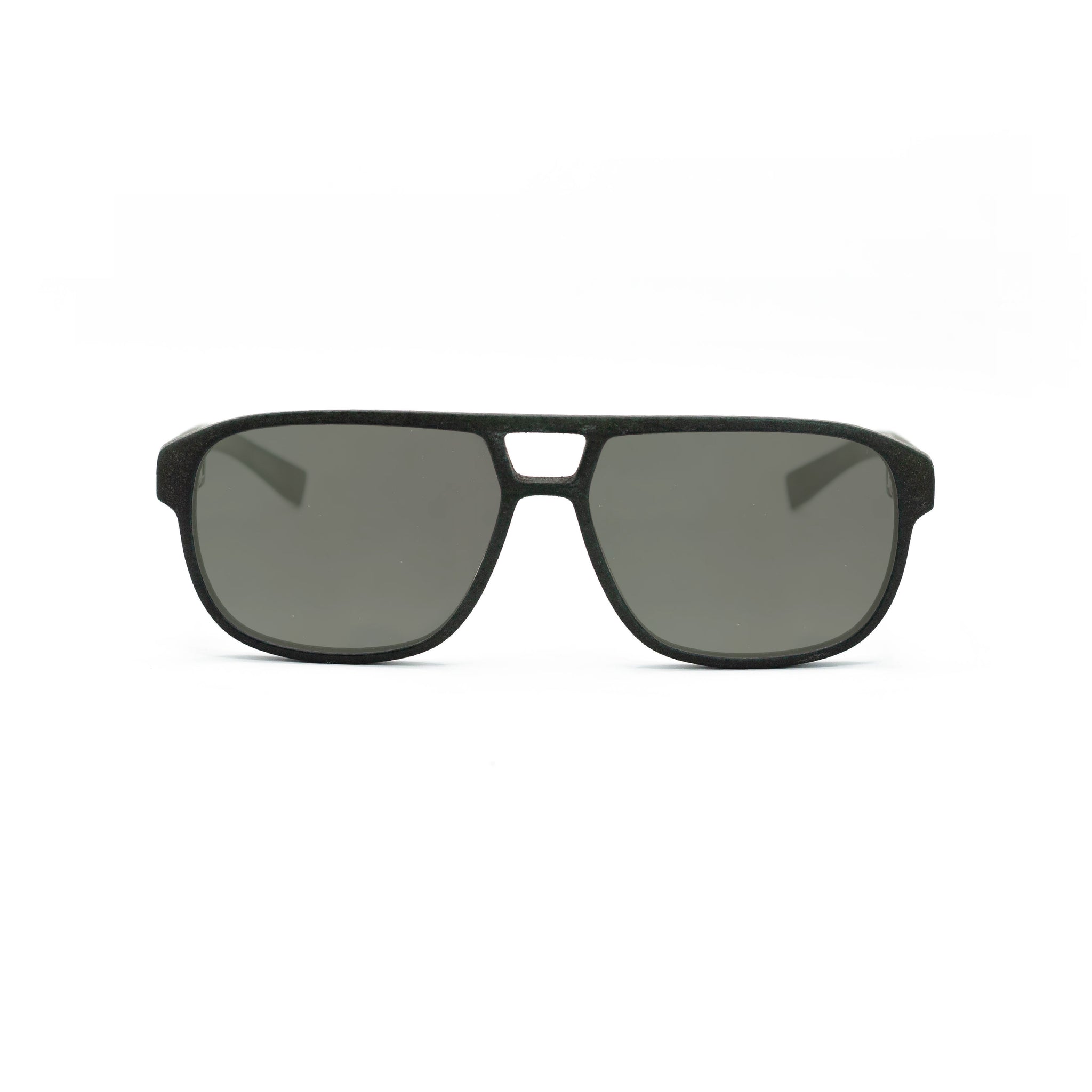 La monture arbore une forme rectangulaire anguleuse avec un pont marqué, évoquant les codes du design sportif tout en restant sobre. Sa teinte noire légèrement granitée apporte une finition brute et texturée, idéale pour celles et ceux qui apprécient les lignes franches et la discrétion élégante.