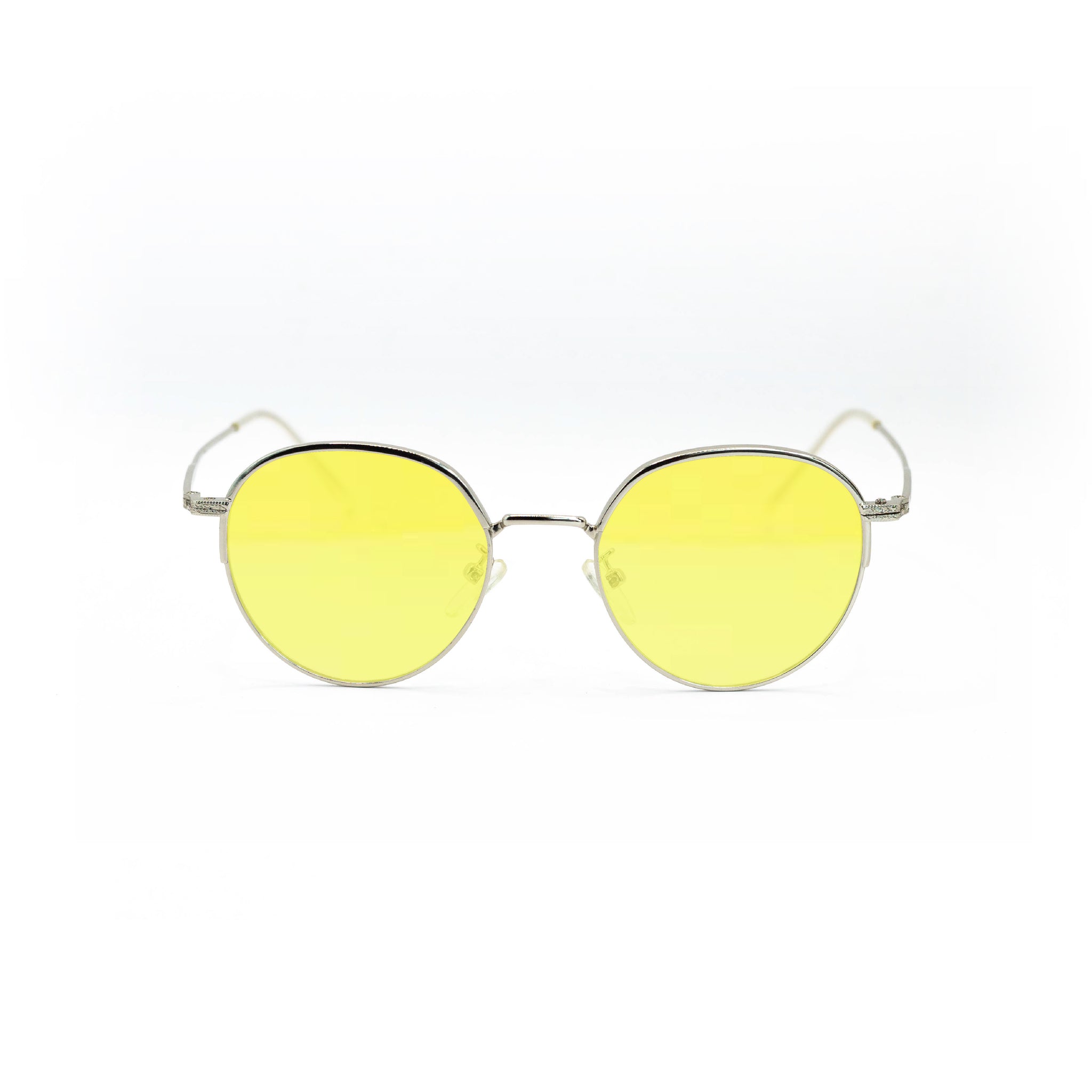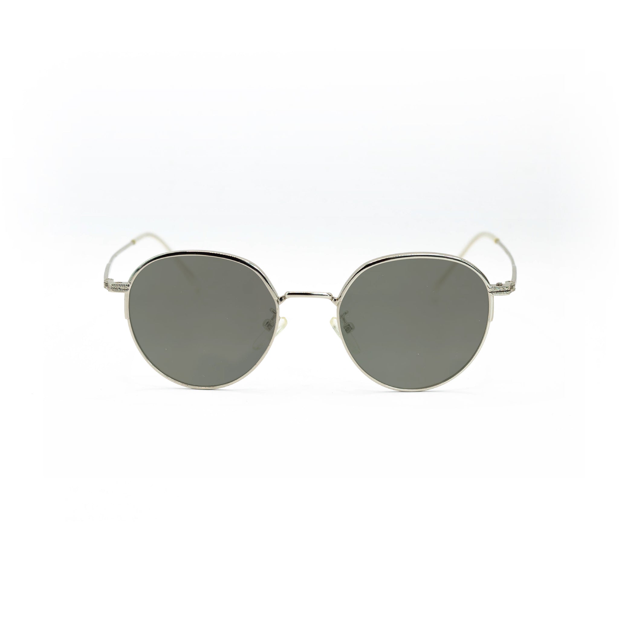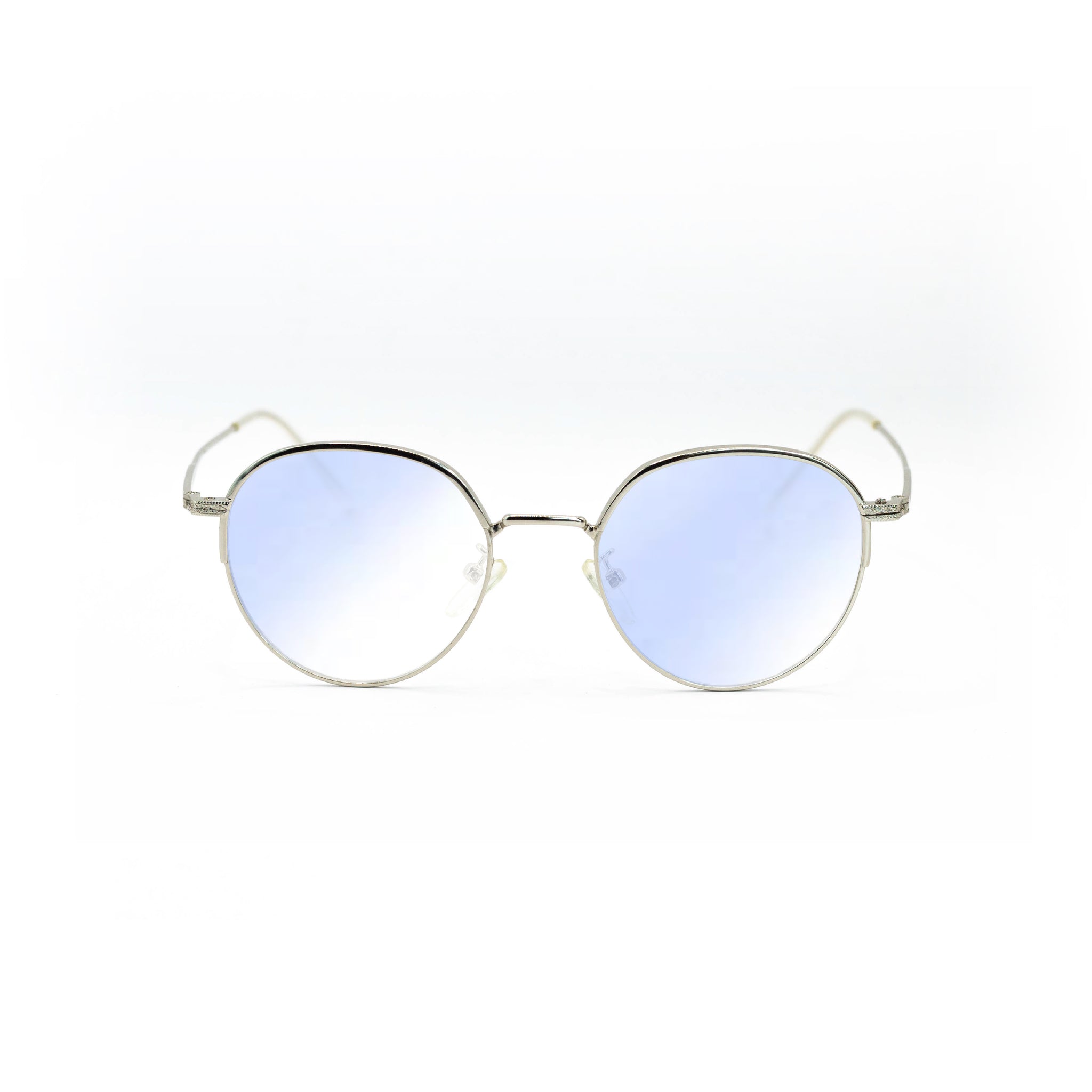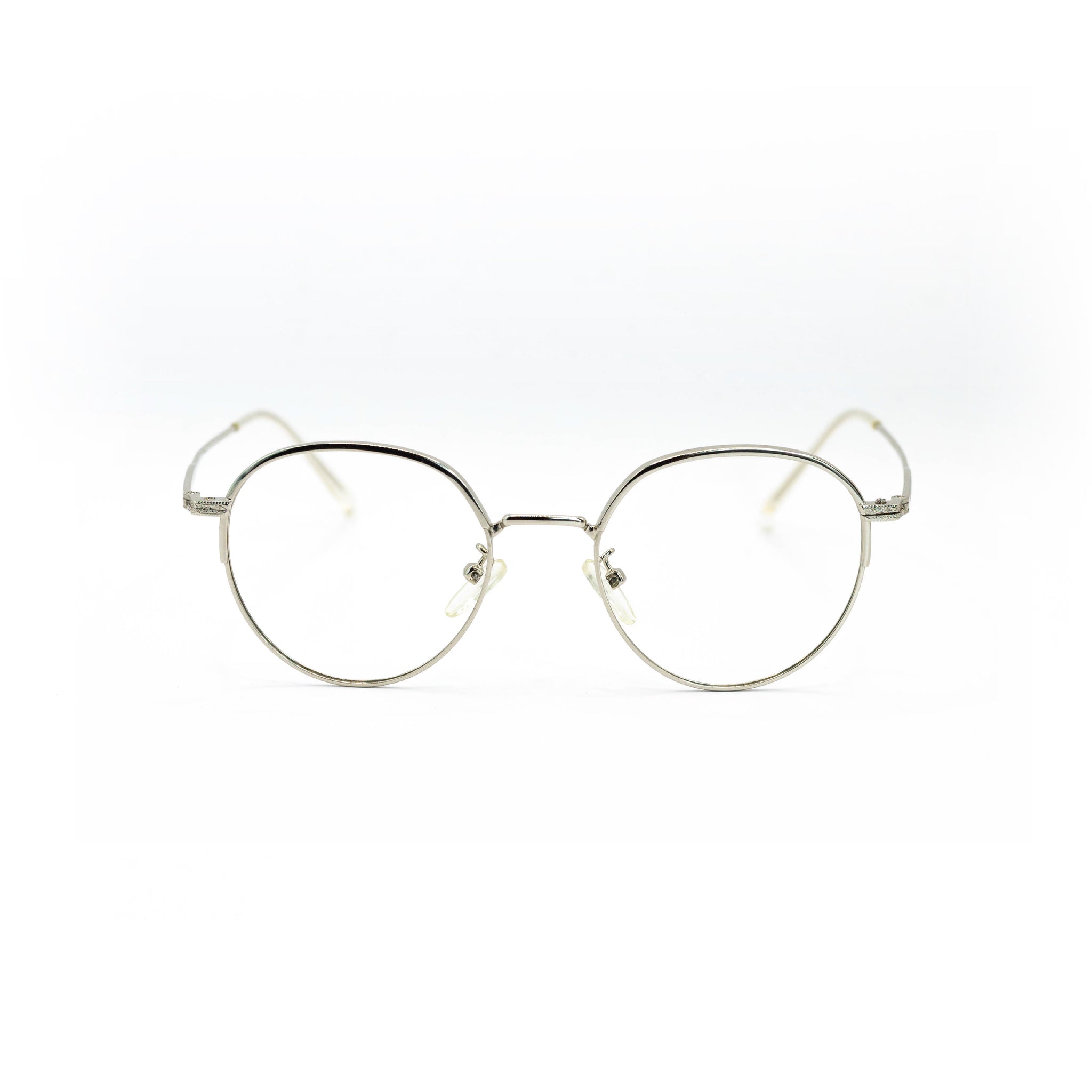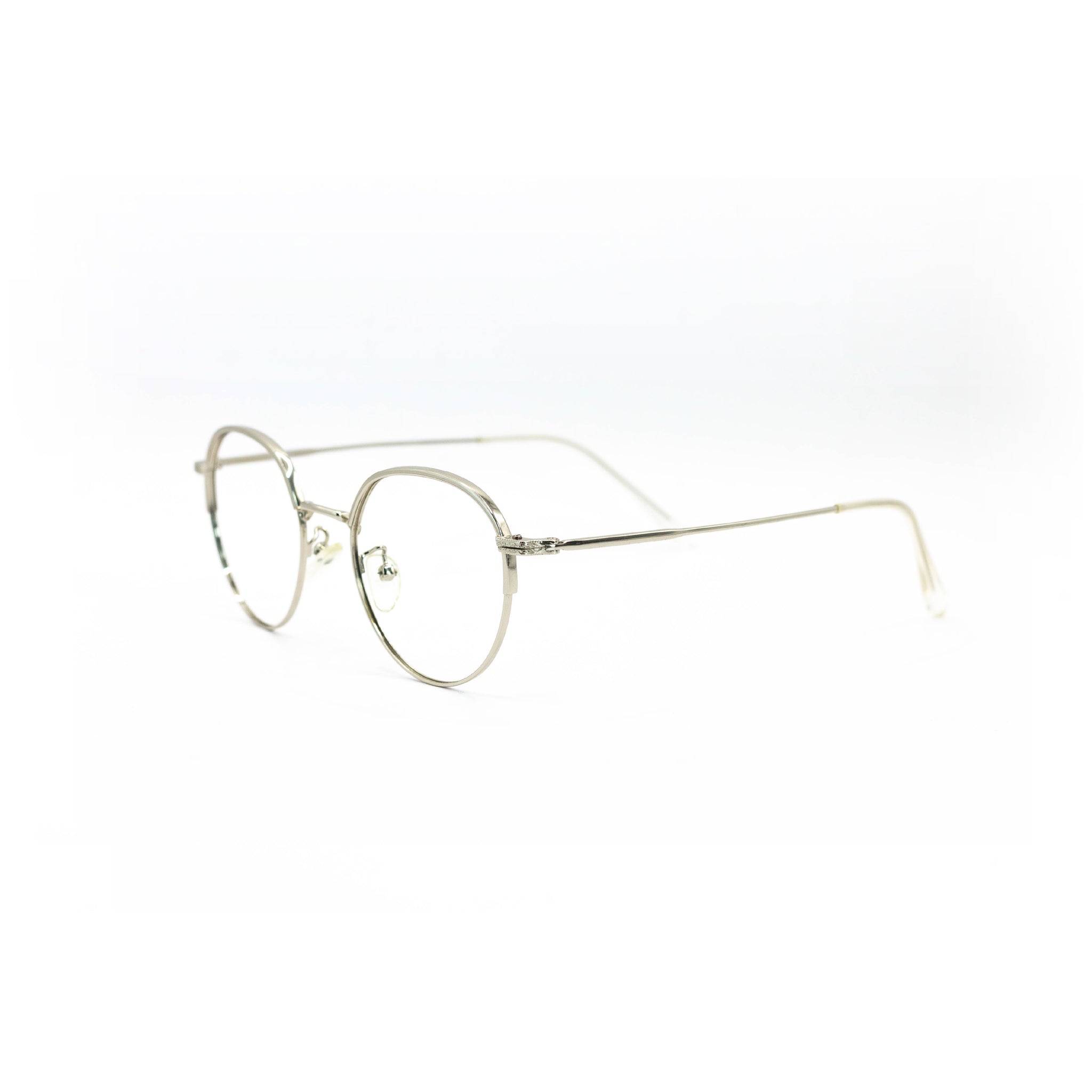 Cette monture 100 % en métal arbore une forme ronde fine, légèrement étirée sur la hauteur, avec une finition argentée brillante qui capte la lumière tout en restant élégante. Les branches ultra-fines et les plaquettes réglables renforcent le confort et la légèreté de l’ensemble, pour une sensation presque imperceptible au porté.