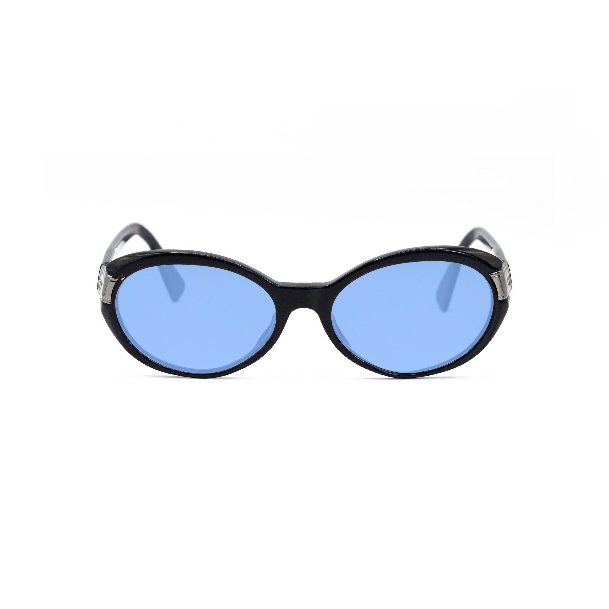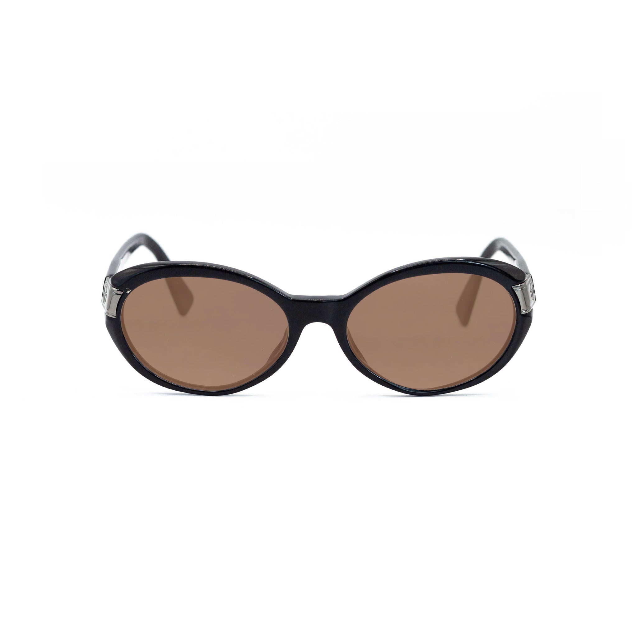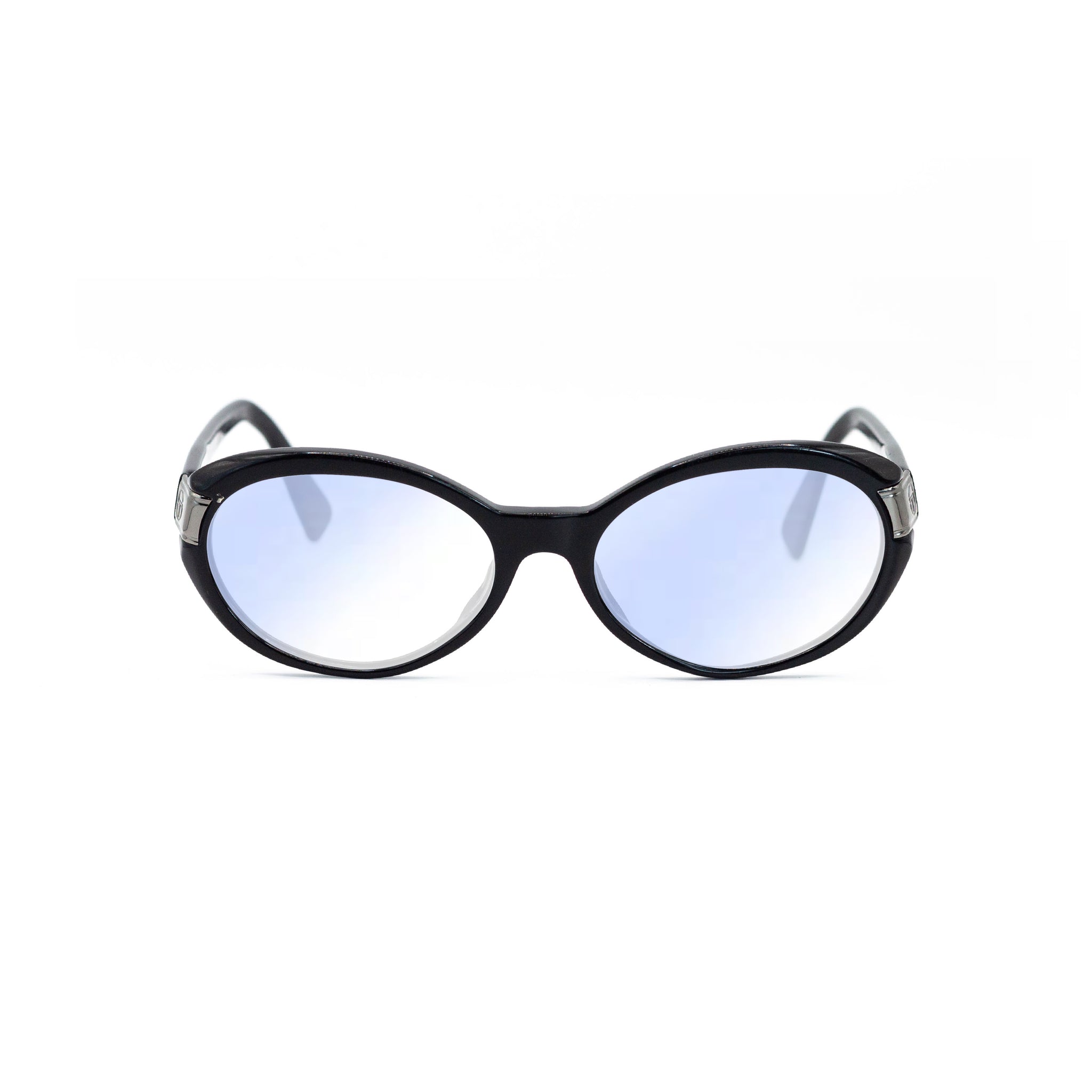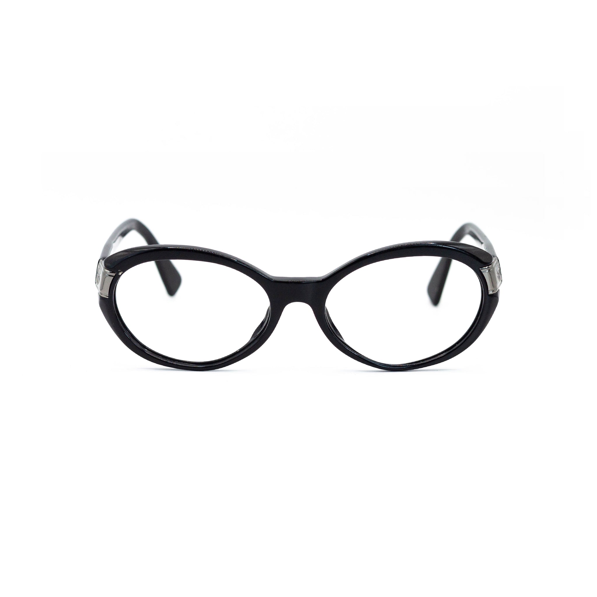 La monture en acétate noir brillant adopte une forme ovale adoucie, à la fois intemporelle et originale. Elle se distingue par ses branches épaisses et son emblématique charnière métallique siglée, qui renforce l’identité de la marque avec sobriété. Un design équilibré entre minimalisme et caractère.