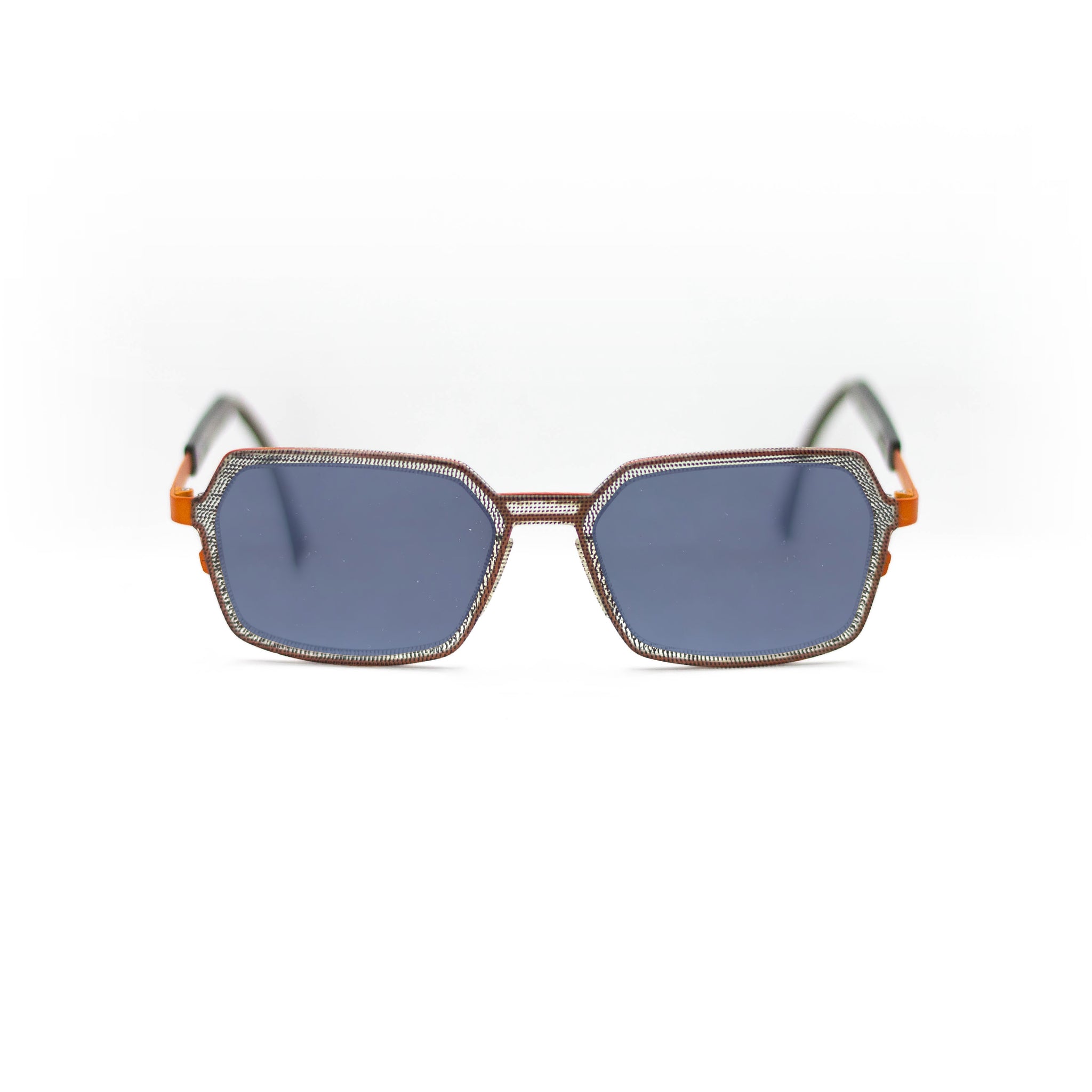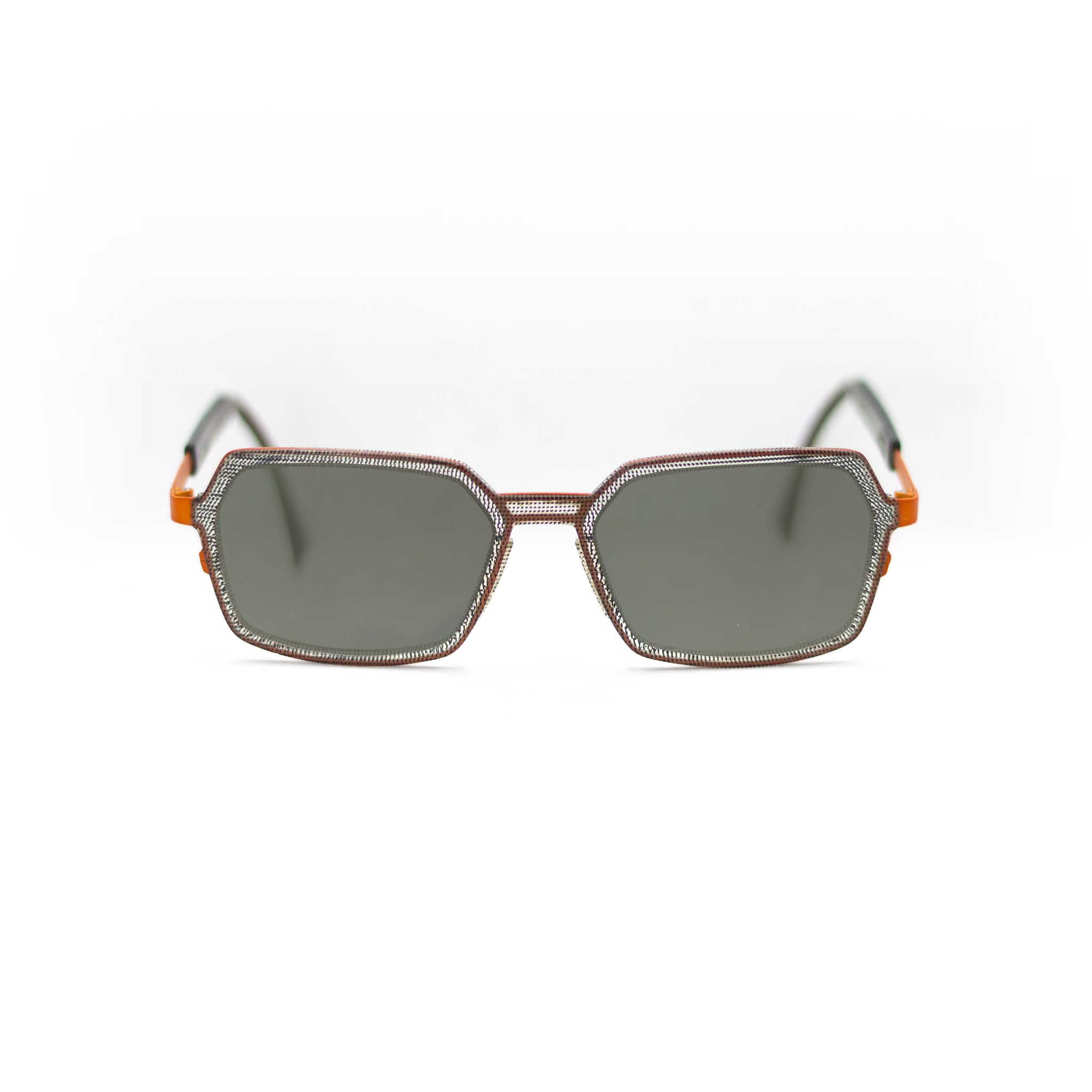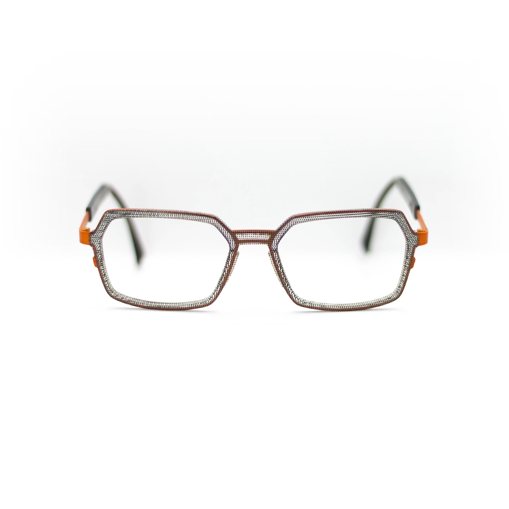 Avec leur forme géométrique originale à mi-chemin entre le rectangle et l’octogone, ces lunettes séduisent par leur singularité. La face présente un motif tramé noir et gris, presque textile, qui contraste subtilement avec le pont et les branches en métal orange vif. Cette monture combinée joue sur les matières et les couleurs pour offrir un équilibre parfait entre sophistication et énergie.