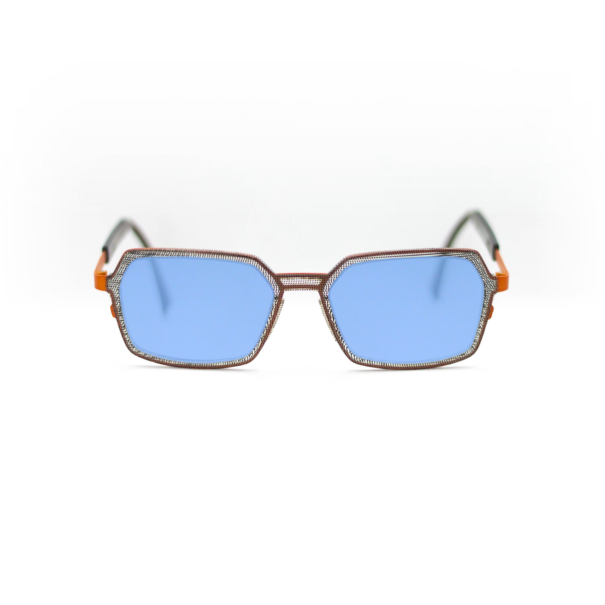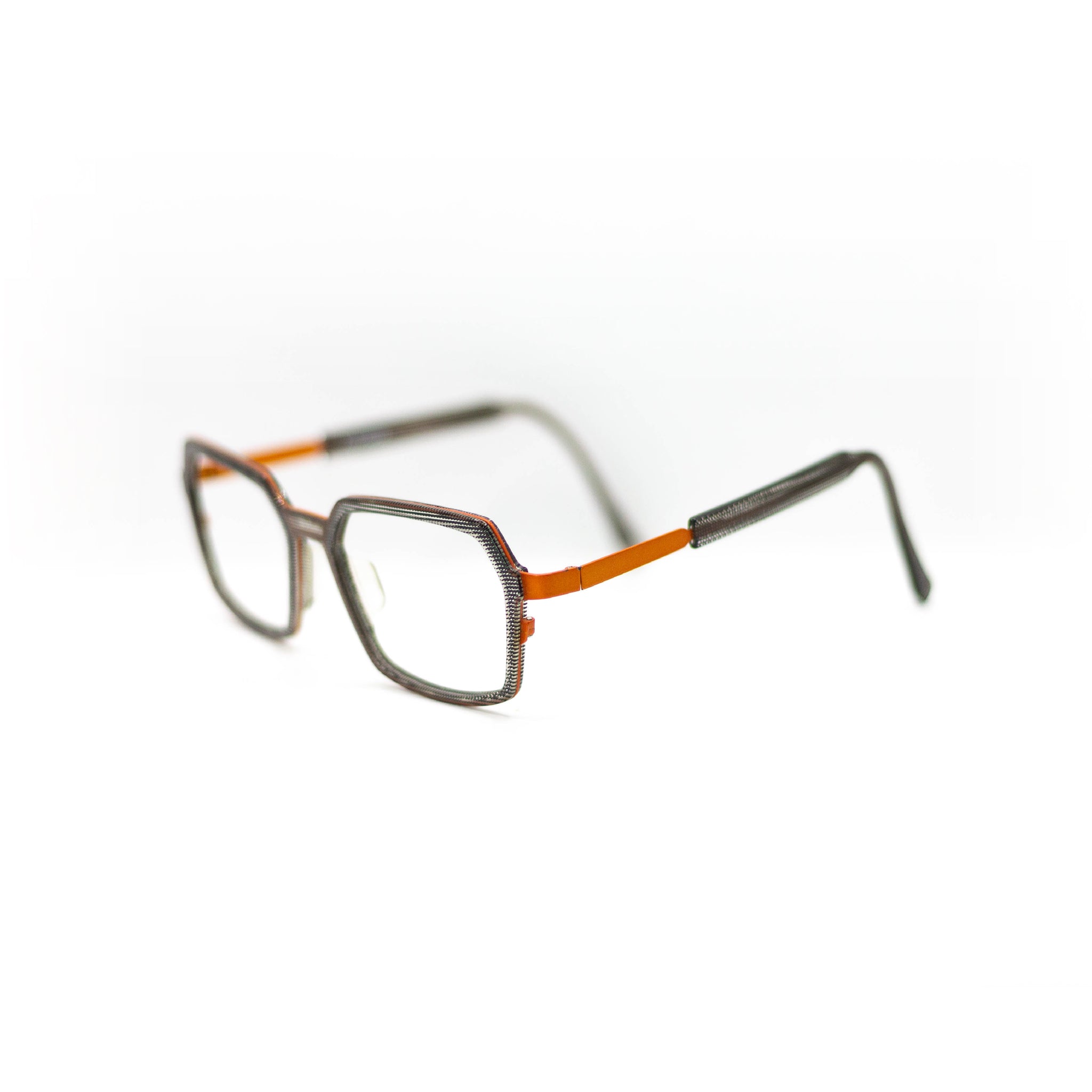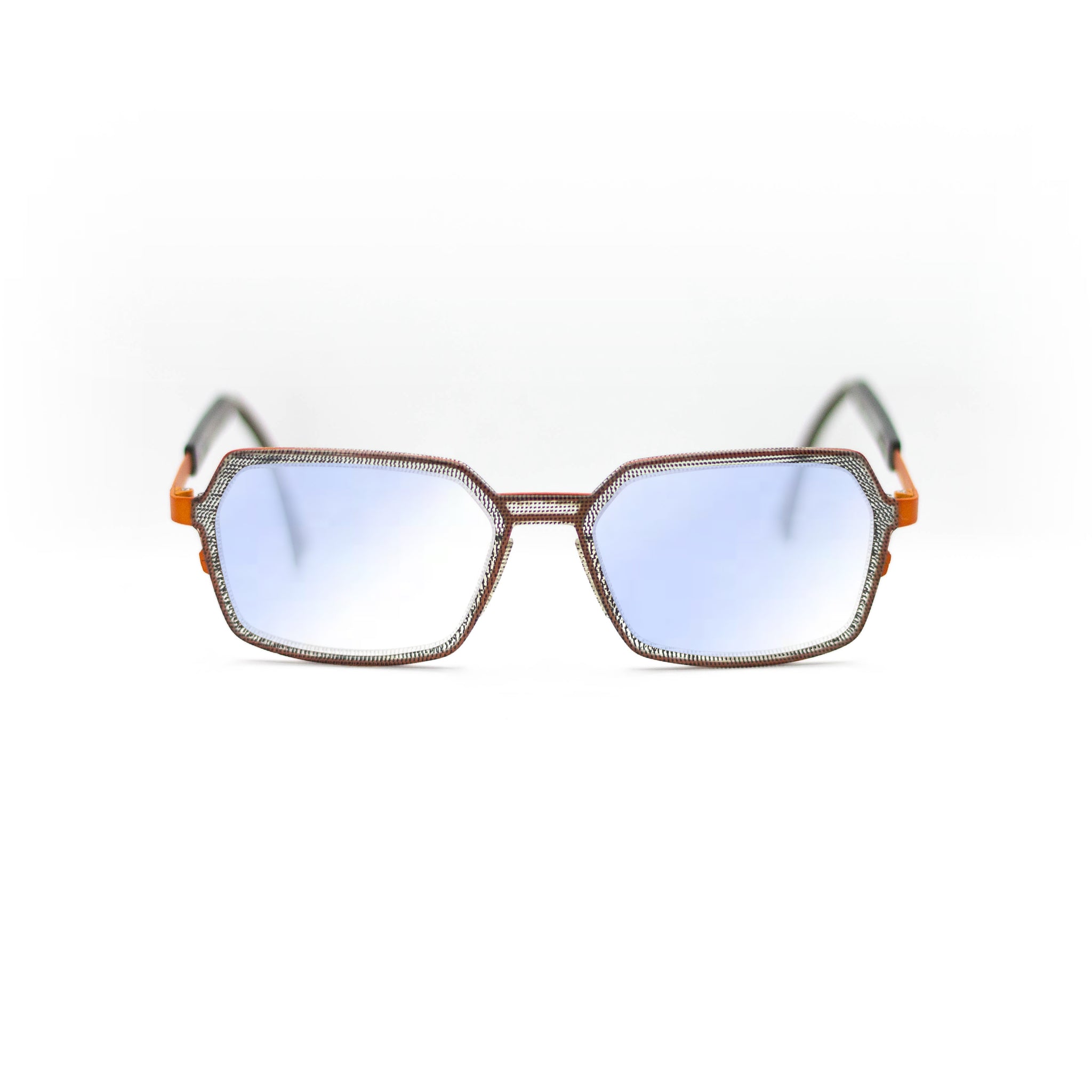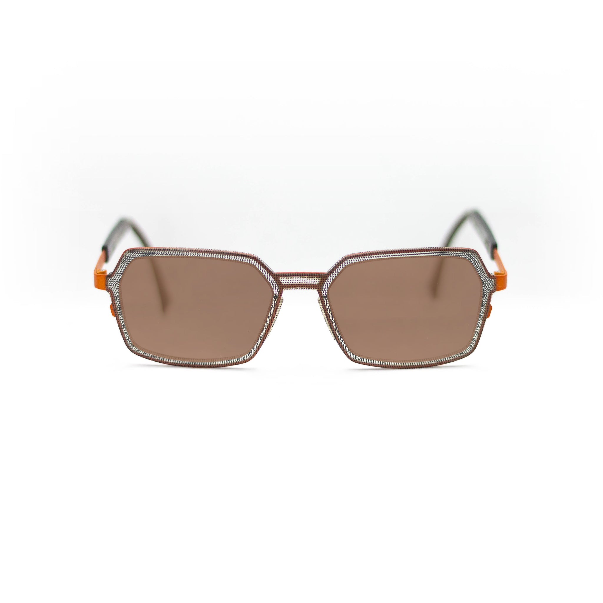 Avec leur forme géométrique originale à mi-chemin entre le rectangle et l’octogone, ces lunettes séduisent par leur singularité. La face présente un motif tramé noir et gris, presque textile, qui contraste subtilement avec le pont et les branches en métal orange vif. Cette monture combinée joue sur les matières et les couleurs pour offrir un équilibre parfait entre sophistication et énergie.
