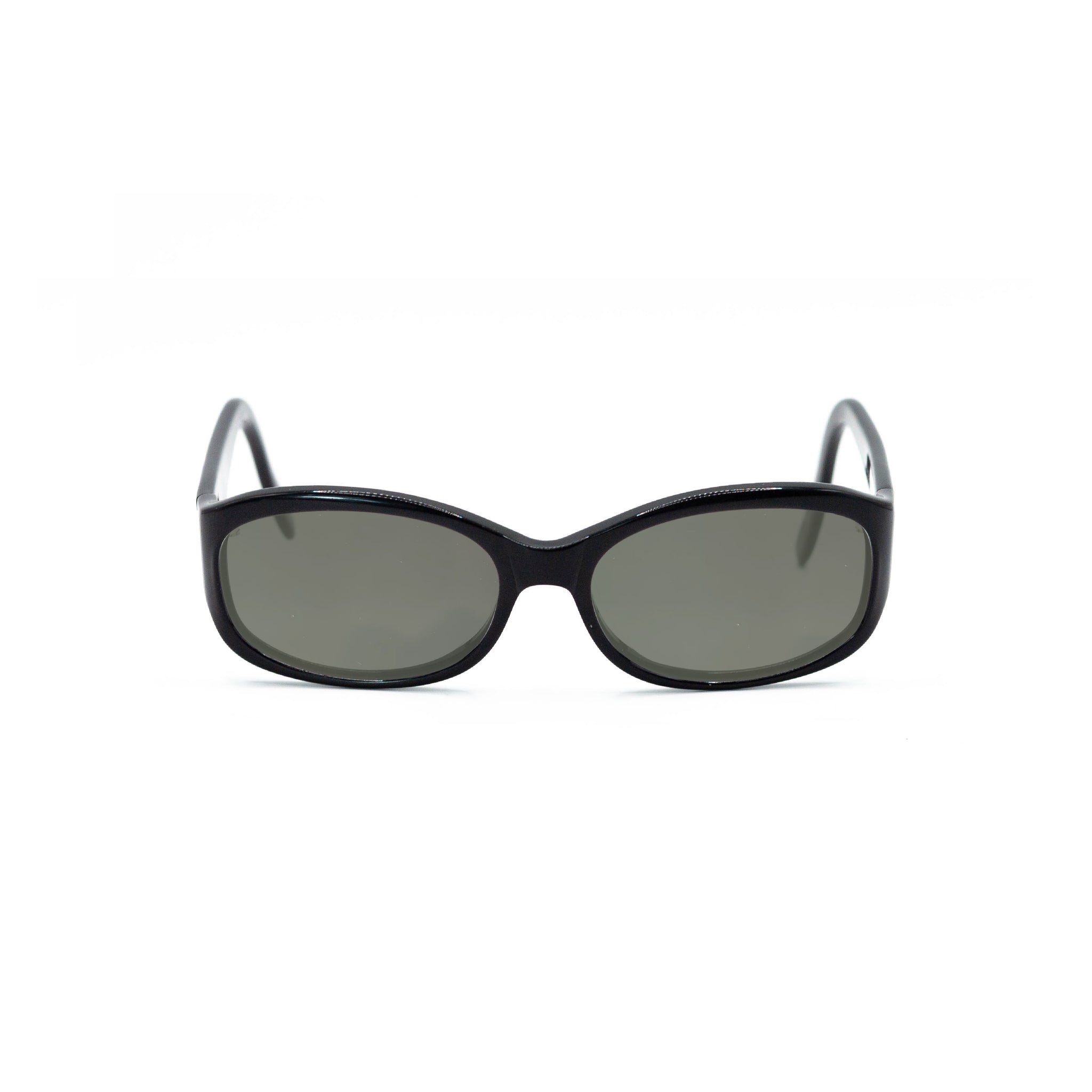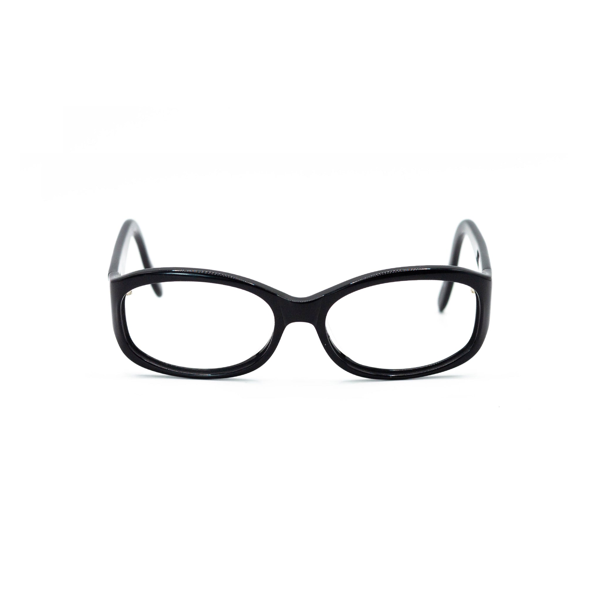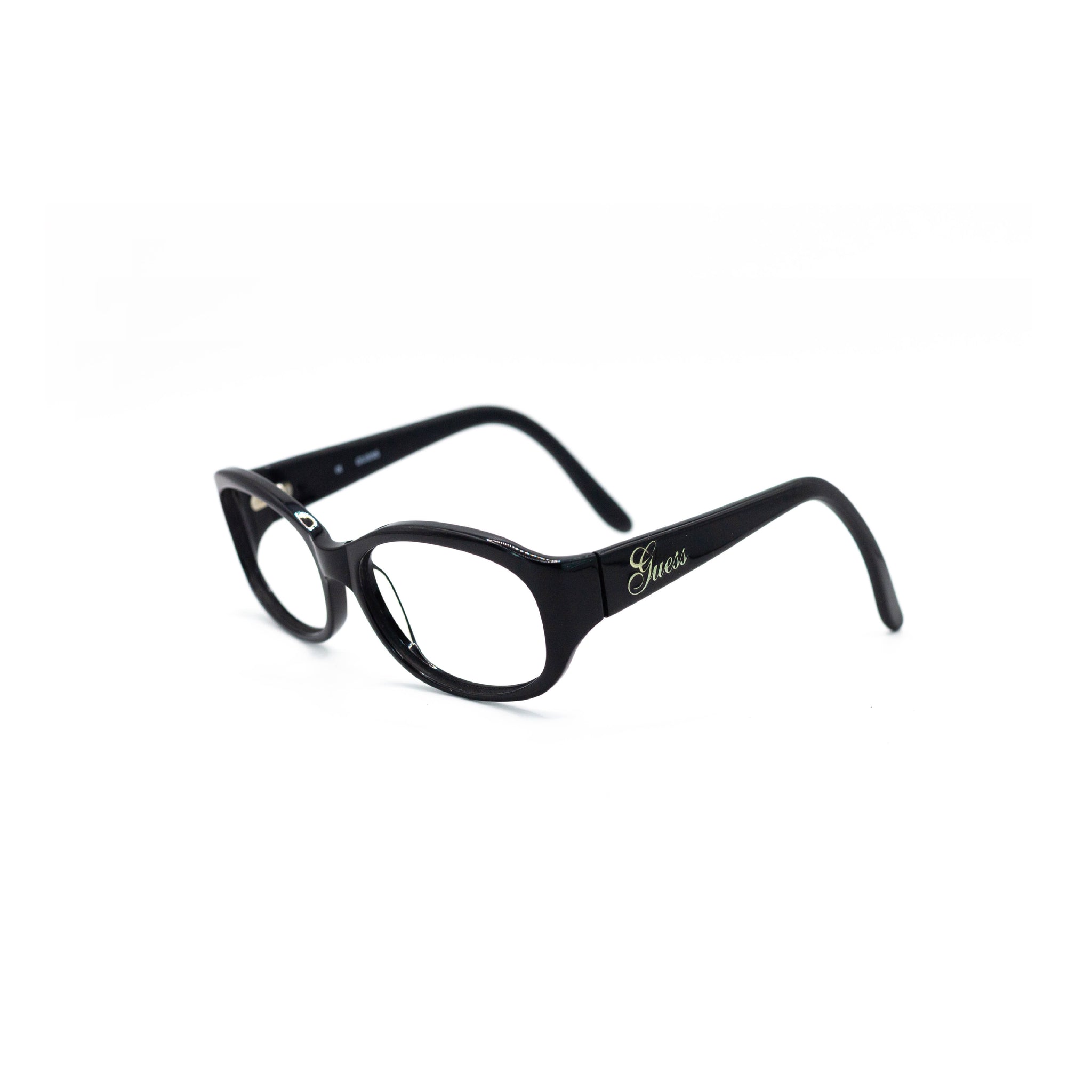 Cette monture en plastique noir brillant adopte une forme ovale légèrement étirée, à mi-chemin entre l'œil de chat adouci et l’ovale classique. Les branches galbées s’élargissent vers les tempes pour accueillir un logo Guess doré en écriture cursive, clin d’œil glamour aux codes du style Y2K.