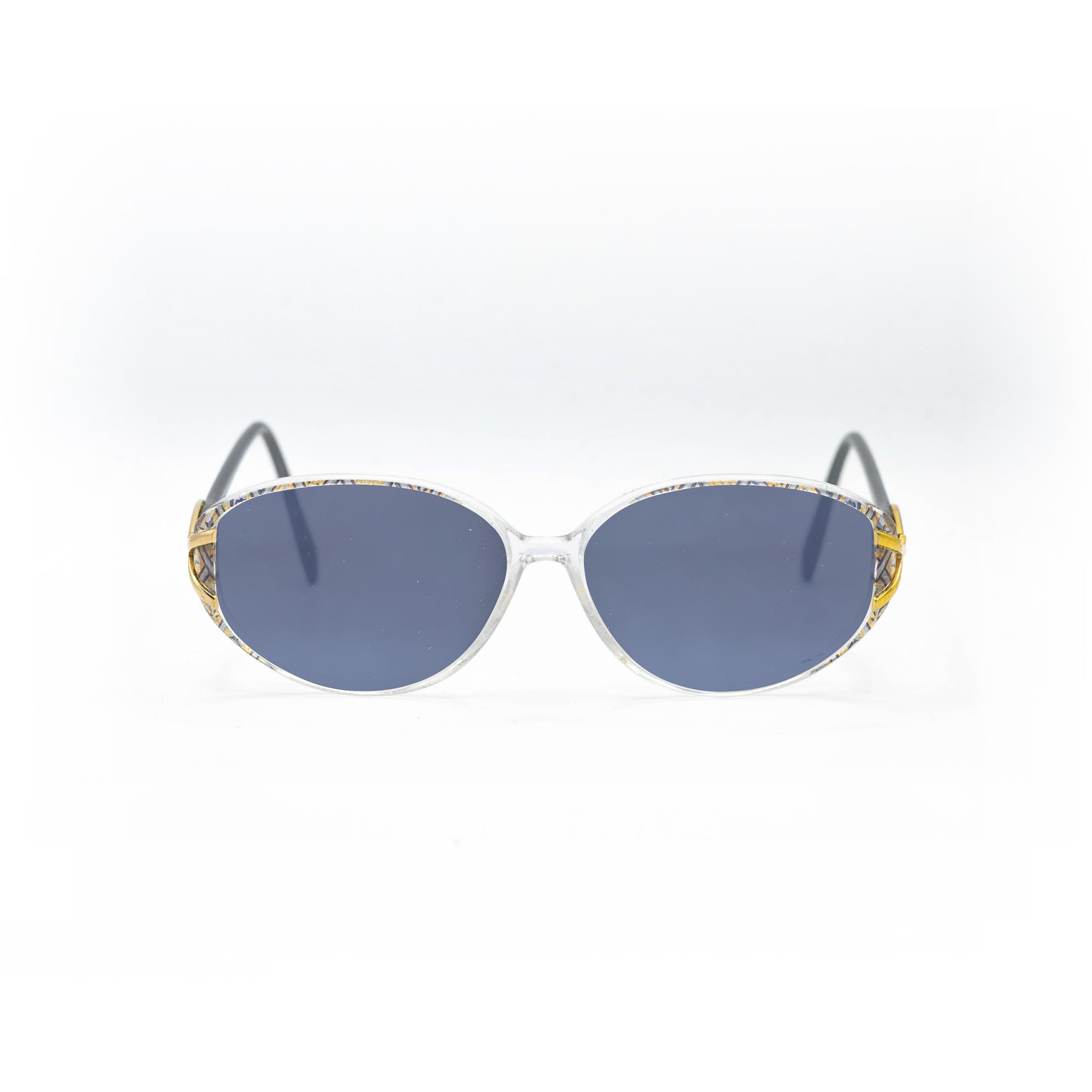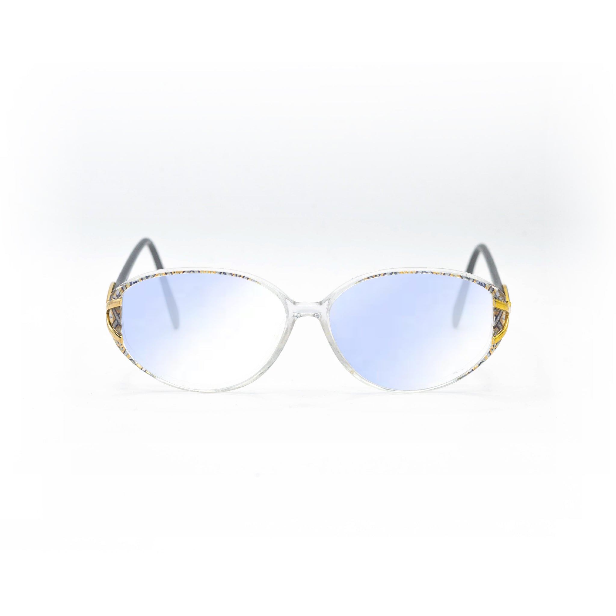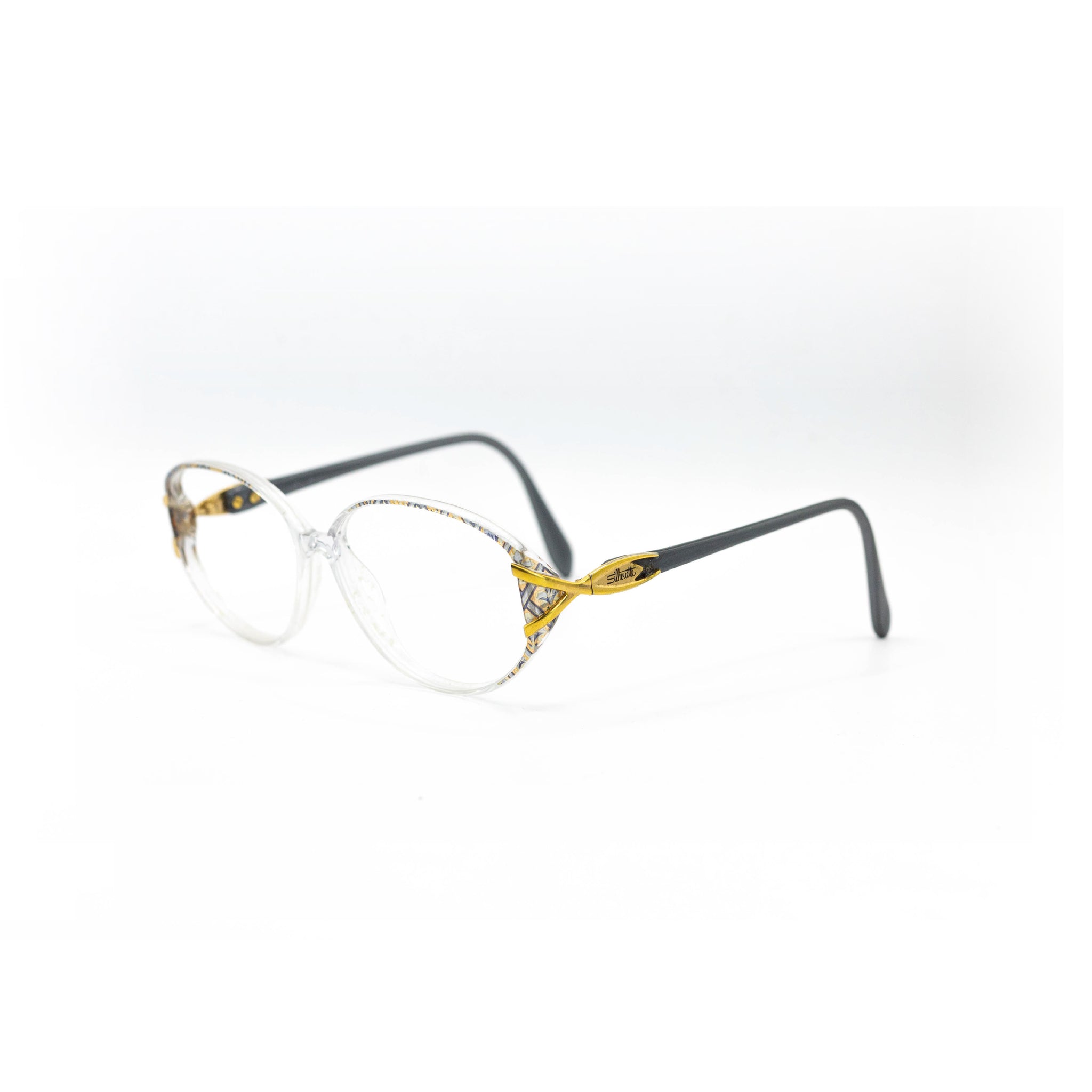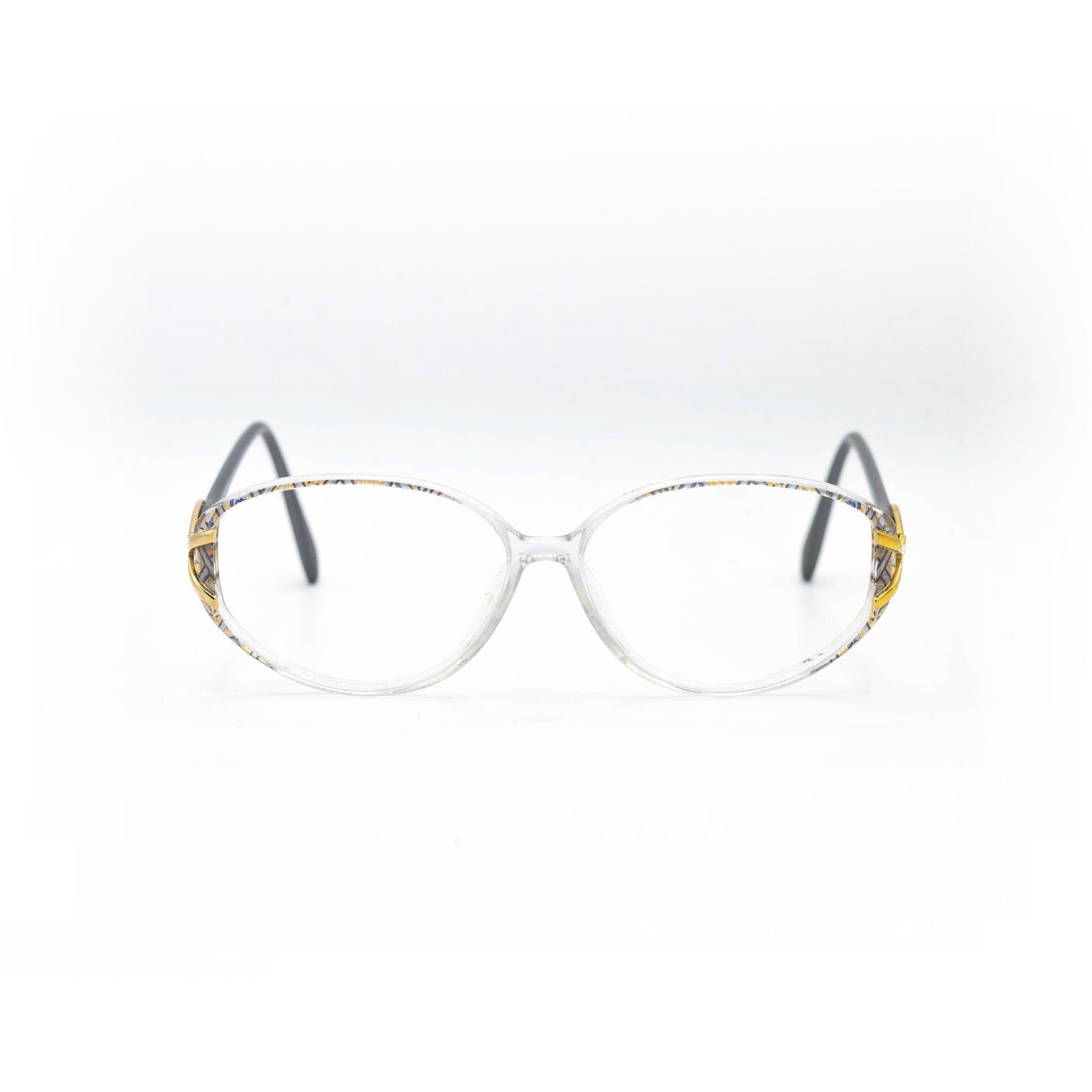 Cette monture combinée acétate et métal adopte une forme papillon douce et féminine, avec un contour transparent rehaussé de motifs dorés et noirs qui évoquent la finesse d’un vitrail. Les branches en métal noir mat viennent structurer l’ensemble sans alourdir le visage, dans un esprit minimaliste et contemporain.