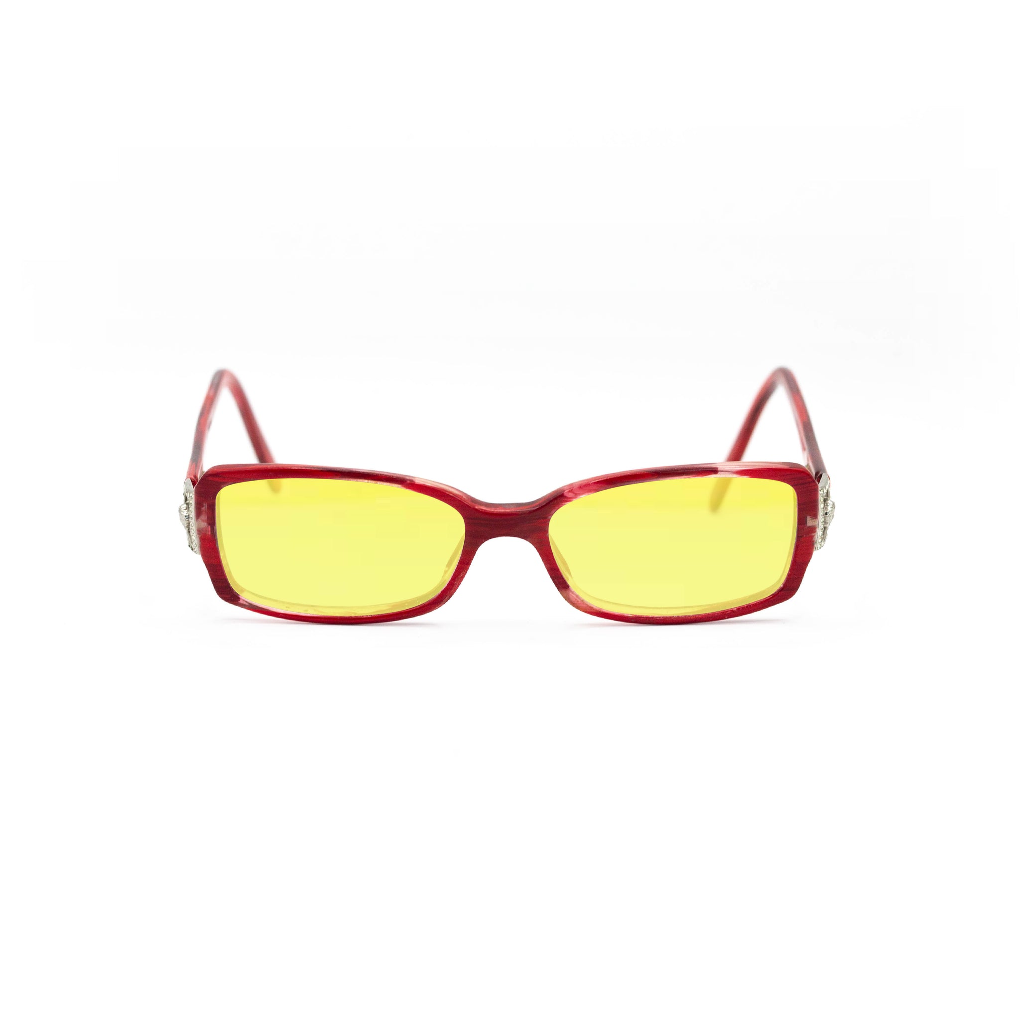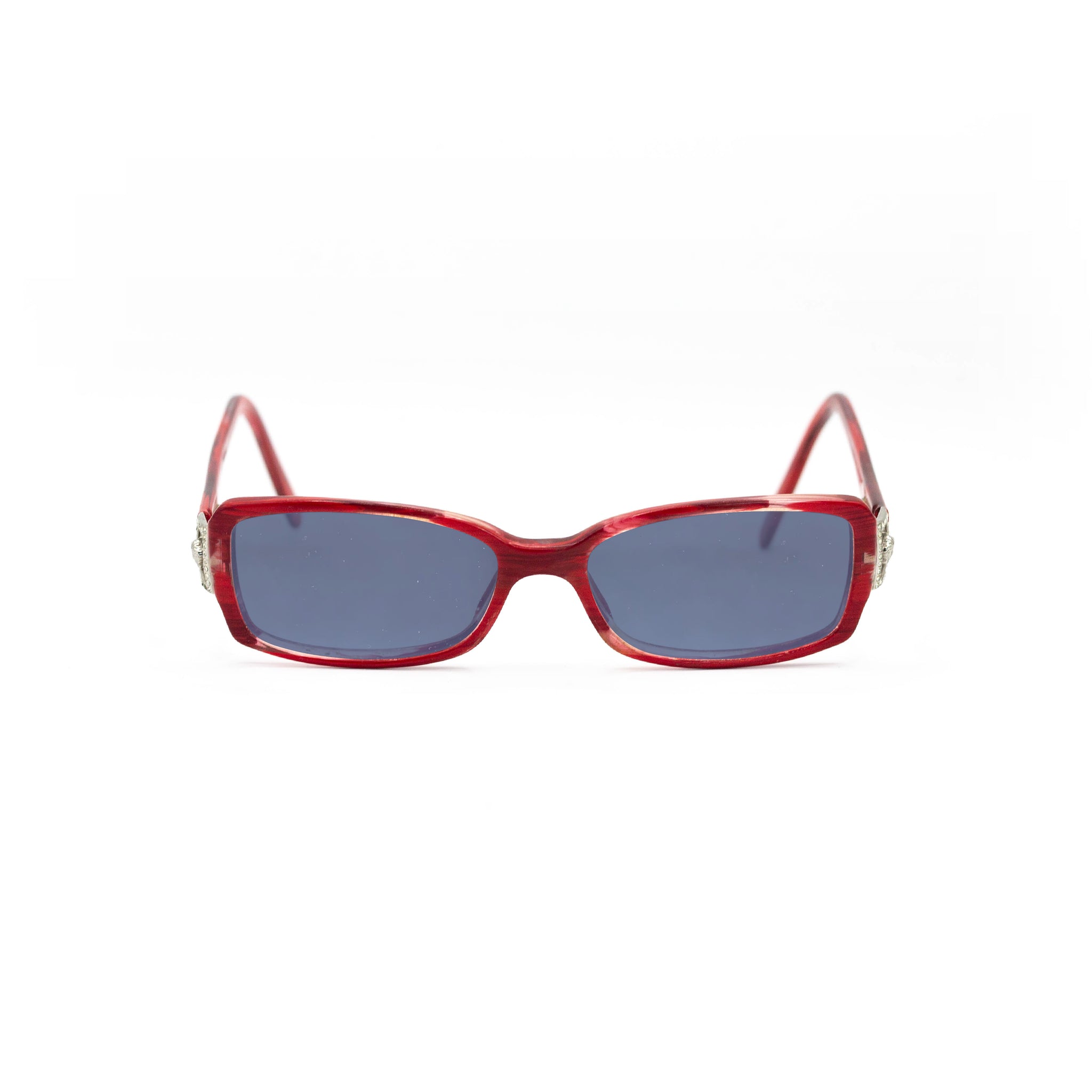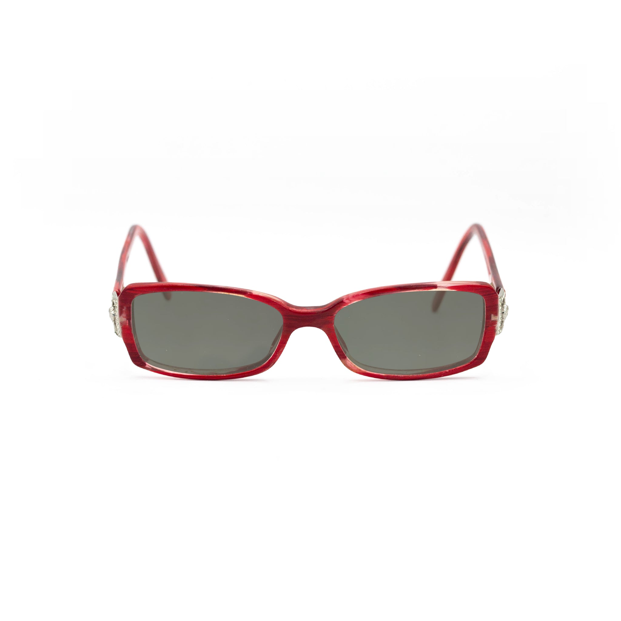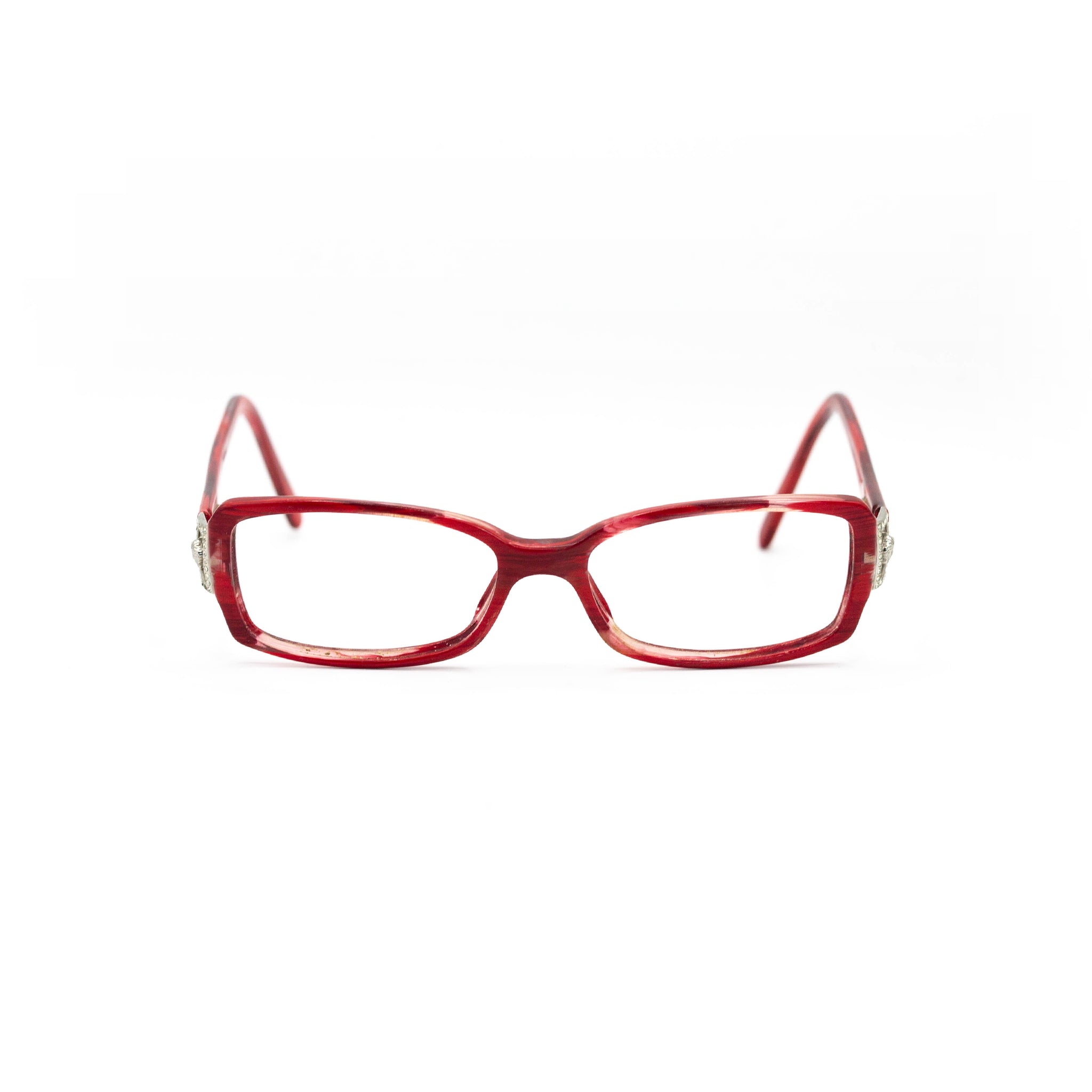 La monture en acétate marbré rouge grenat adopte une forme rectangulaire légèrement papillon, soulignée par un détail métallique orné de strass à la charnière, typique de l’ADN Versace. Le contraste entre le rouge intense et l’élément bijou crée un effet visuel audacieux, à mi-chemin entre accessoire de mode et objet d’art.